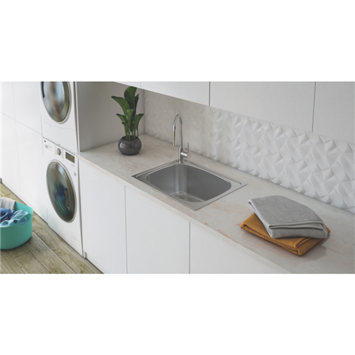 Bring home the ultimate laundry solution with the Oliveri Laundry 45 Litre Tub With Rinse Bypass. Crafted from durable stainless steel in a sleek silver finish this top mount sink adds a touch of modern style to your laundry. The generous 45 litre capacity equipped with a handy rinse bypass provides ample room for washing the largest loads. With a width of 590mm depth of 470mm and height of 235mm it fits easily into standard cabinets. The two included tap holes allow you to customize your setup while adjustable clips and sealing foam ensure an easy secure fit. Complete with a basket waste and AC14 accessory this Australian made sink comes backed by Oliveri's lifetime warranty for lasting peace of mind. Give your laundry an upgrade with the versatile tub that brings efficiency style and quality to your home. The manufacturer's part number for this product is TI45S.