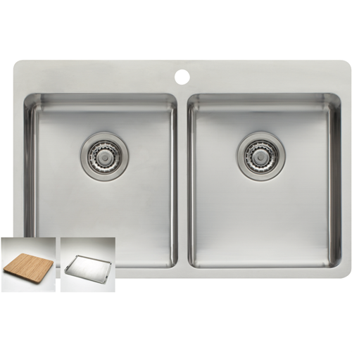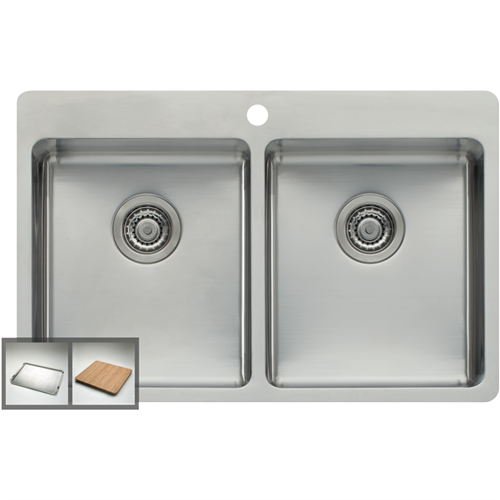Transform your kitchen into a stylish and functional space with the Oliveri Sonetto Double Bowl Topmount Sink. Expertly crafted from durable stainless steel this sink features a modern design with soft rounded corners to complement any décor. The generous double bowl configuration offers abundant room for washing dishes preparing meals and more while the included bamboo chopping board and stainless steel drainer provide added convenience. Installation is a breeze with the top mount design that drops effortlessly into your benchtop. Beyond the sleek aesthetics Oliveri built this sink for everyday longevity backing it with a lifetime warranty. Bring home the Oliveri Sonetto and experience the difference a premium sink makes. The manufacturer's part number for this product is SN1064. Contact us today to learn more about this topmount kitchen sink.