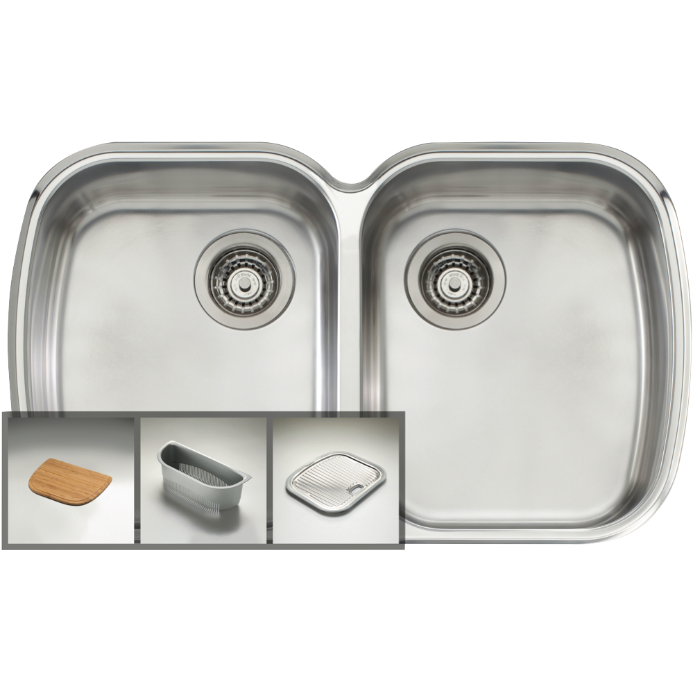 Transform your kitchen with the elegant and functional Oliveri Monet Double Bowl Undermount Sink. This stainless steel sink features a modern design with two spacious D-shaped bowls to maximize workspace. The main 24L bowl with rear drain showcases Oliveri's signature curvaceous style while the smaller 24L bowl adds versatility for multitasking. Both bowls deliver ample room for washing large cookware with ease. This durable easy-to-clean sink includes a bamboo chopping board stainless steel utility tray colander and basket wastes for optimized functionality. With its solid supporting bridge extra capacity main bowl and lifetime warranty the Oliveri Monet sink is built to last while complementing your kitchen aesthetic beautifully. Experience the difference an Oliveri sink makes - this is the perfect choice to upgrade your home. The manufacturer's part number for this product is MO70U. Consider the Oliveri Monet sink for your kitchen today.