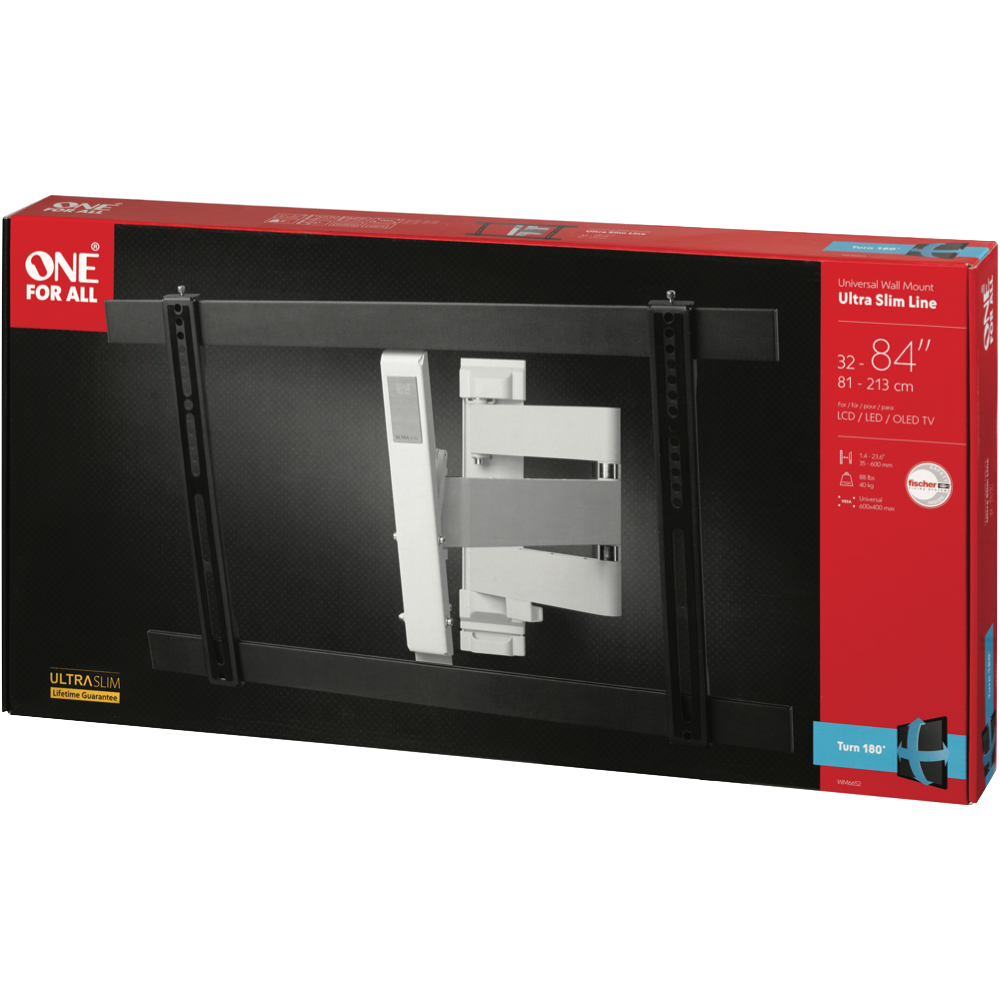 Mount your TV in style with the One For All UltraSlim Turn180 40kg TV Bracket. This sleek and versatile wall bracket is designed to fit most 32-90 TVs up to 40kg with a maximum VESA pattern of 600 x 400mm. Extend your viewing experience 35-600mm from the wall and tilt your TV up to 180 degrees for the perfect viewing angle. With a slim profile that protrudes just 38mm this bracket blends seamlessly into your decor. The Turn180 makes it easy to find the ideal placement in your living room bedroom or office. Simply turn your TV left or right up to 180 degrees to reduce glare and improve visibility. Crafted from durable steel this sturdy bracket mounts your TV securely and includes all necessary fittings for a straightforward installation. Give your flat screen a streamlined new home and enjoy endless viewing possibilities with the One For All UltraSlim Turn180 40kg TV Bracket. The manufacturer's part number for this product is WM6652.