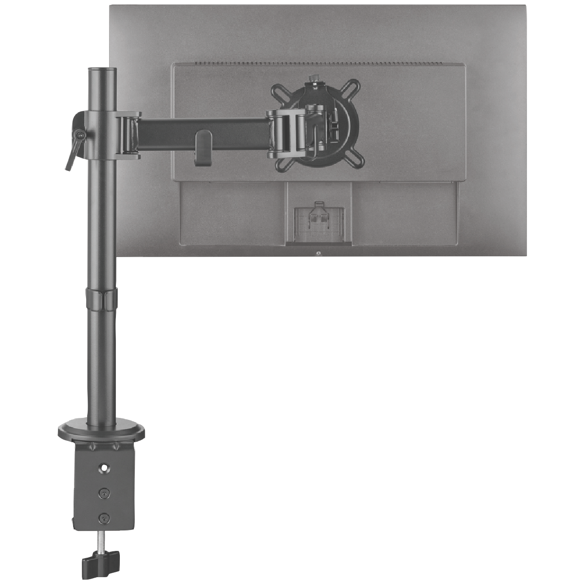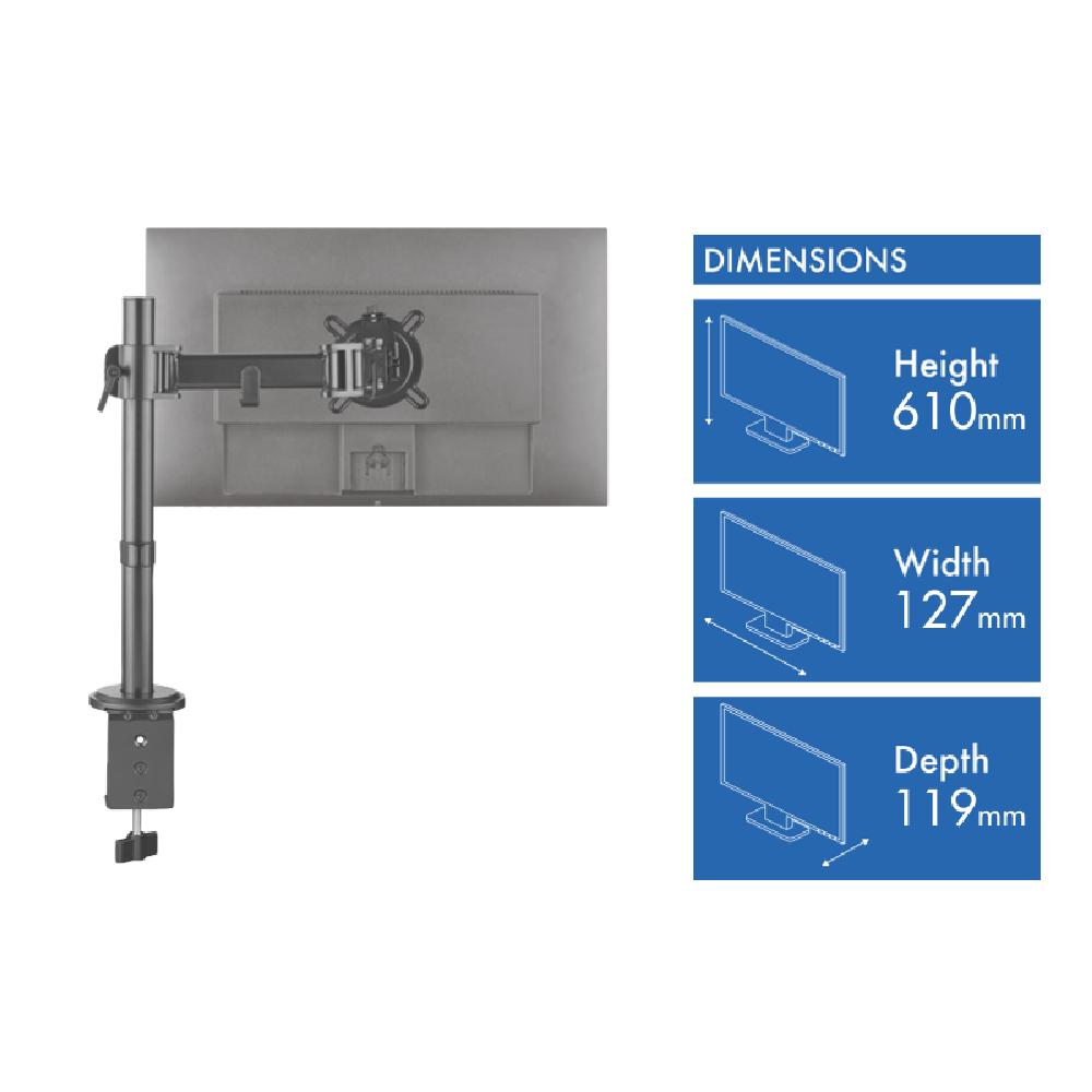 Transform your workspace with this sleek black Single Arm Smart Series Monitor Arm that fits most monitors between 13 and 32. The adjustable arm gives you complete flexibility to position your screen at the perfect height and angle for comfortable viewing. With dimensions of 609.5mm height 127.3mm width and 119mm depth it takes up minimal desk space while providing maximum ergonomic benefits. This sturdy monitor arm comes with a reassuring 10-year manufacturer's warranty giving you long-term peace of mind. Model UE-DM2110.