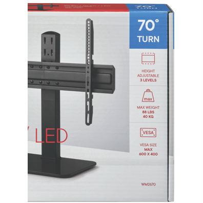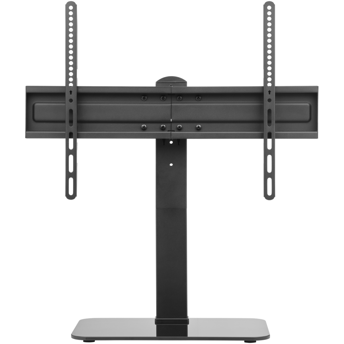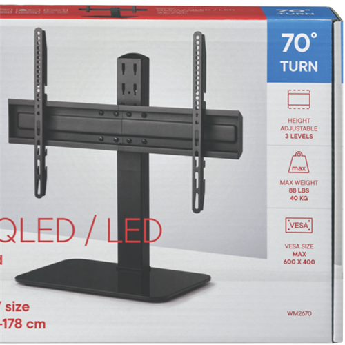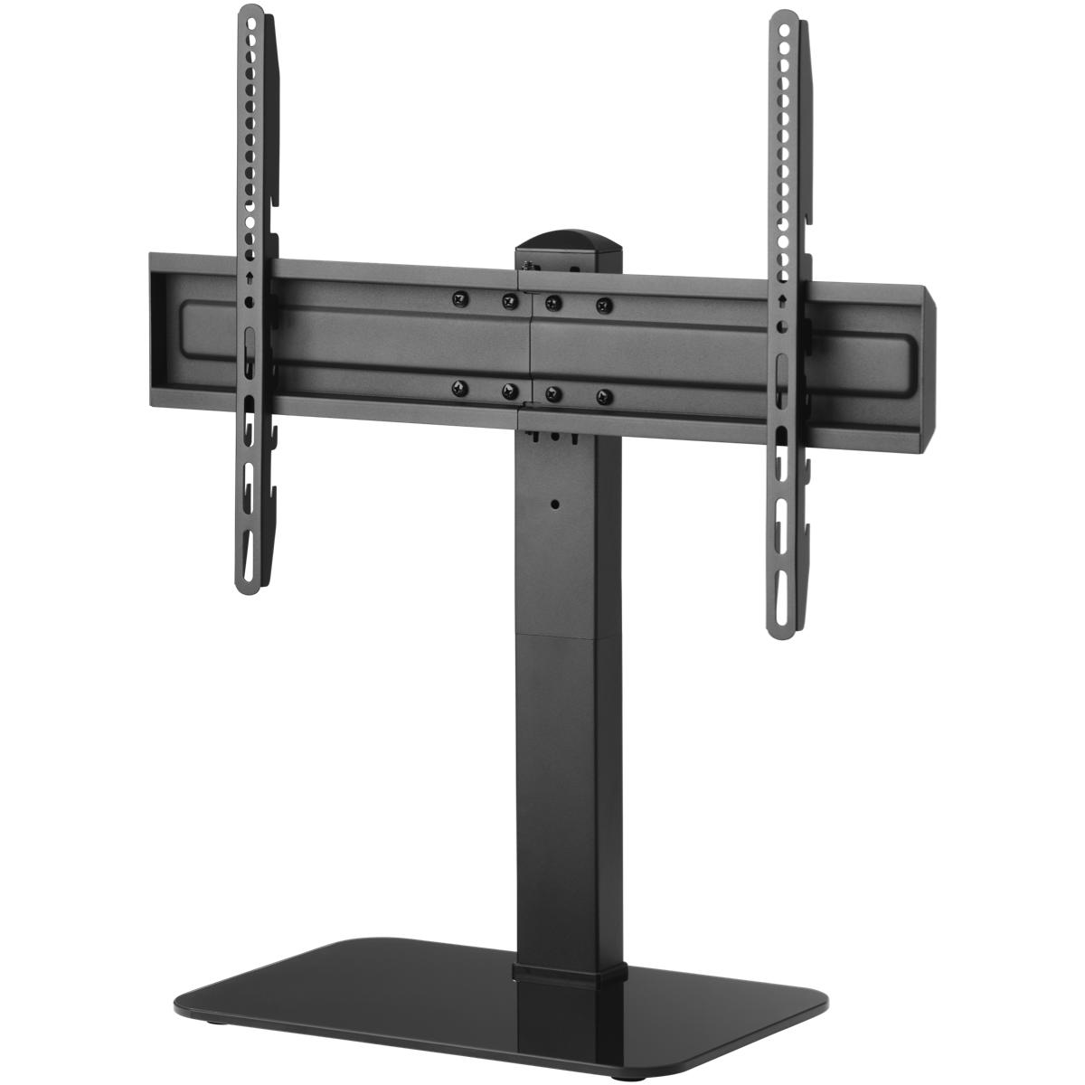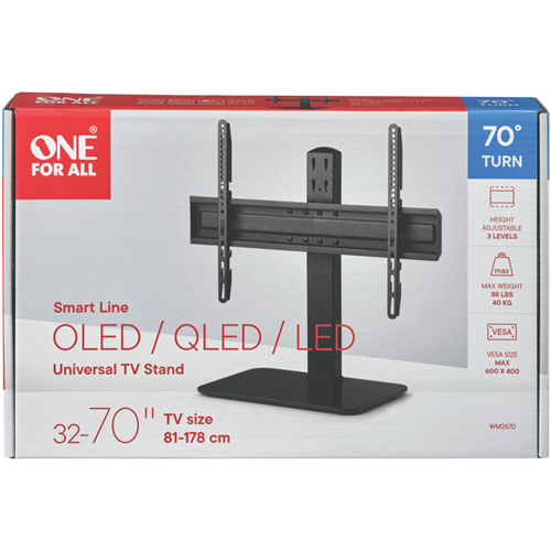 Take control of your living room with the One For All Universal Tabletop TV Stand designed to support televisions up to 70 and weighing up to 40kg. Crafted from sturdy steel with a sleek black finish this stand elevates your display for optimal viewing while keeping cables neatly tucked away for a clean look. The open shelves provide convenient storage for media players soundbars and more. Adjustable feet allow you to find the perfect level surface while an integrated bubble level ensures your TV is perfectly positioned. With a width of 280mm height of 770mm and depth of 640mm this compact stand fits into any space while providing ample support for larger displays. The anti-scratch pads protect your furniture and TV from damage. Assembly is quick and straightforward with the included instructions and hardware. Rest assured this tabletop TV stand comes with a 10 year manufacturer's warranty so your purchase is protected. Bring your living room entertainment to new heights with the One For All TV stand.