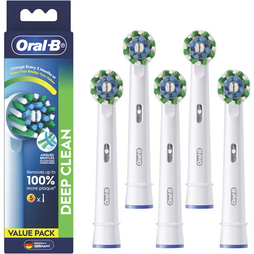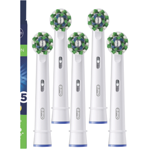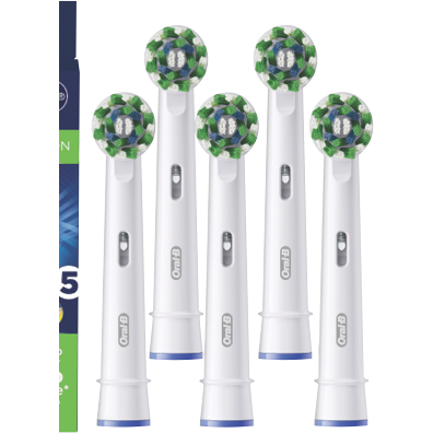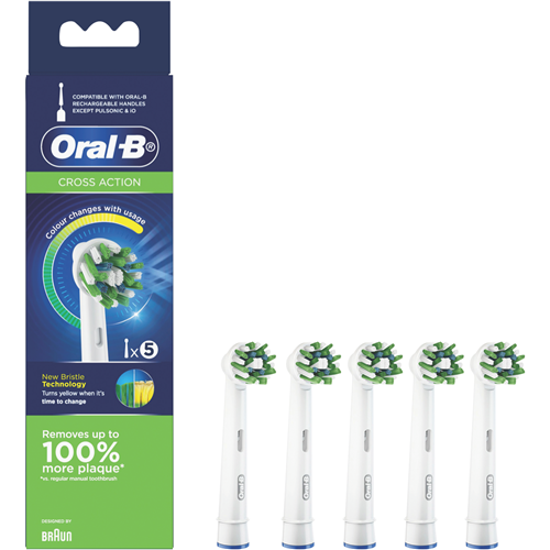 Keep your smile at its best with these Braun Oral B Cross Action Replacement Brush Heads. Each pack includes 5 replacement heads featuring X-shaped bristles that lift trap and remove plaque effectively. The 2200 angled bristles are positioned at 16 degrees to clean efficiently along the gumline for superior plaque removal. You'll know exactly when it's time for a change thanks to the usage indicator - the bristles turn yellow when they need replacing. These heads are compatible with most Oral-B rechargeable handles (except Pulsonic Sonic Complete Vitality Sonic CrossAction Power Clic and Oral B IO). Model number: EB50RX5.