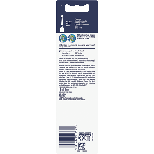 Tidy up your oral care routine with the Oral B Floss Action Replacement Brush Heads 3 Pack. Compatible with most Oral B rechargeable toothbrush handles these replacement brush heads feature oscillating-rotating bristles that remove up to 100% more plaque than a regular manual toothbrush. The floss action bristles deep clean between teeth to gently lift out trapped plaque and debris for a refreshing clean. The bristles turn yellow when it's time to replace your brush head so you know when a refresh is needed. With three replacement heads in each pack you can keep your oral hygiene routine in tip top shape. Give your teeth a thorough clean and enjoy the fresh feeling of a just-brushed smile every day. The manufacturer's part number for this product is VITFAREFILL3PK. Switch out your brush heads regularly for best results.