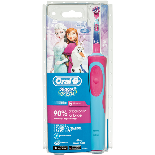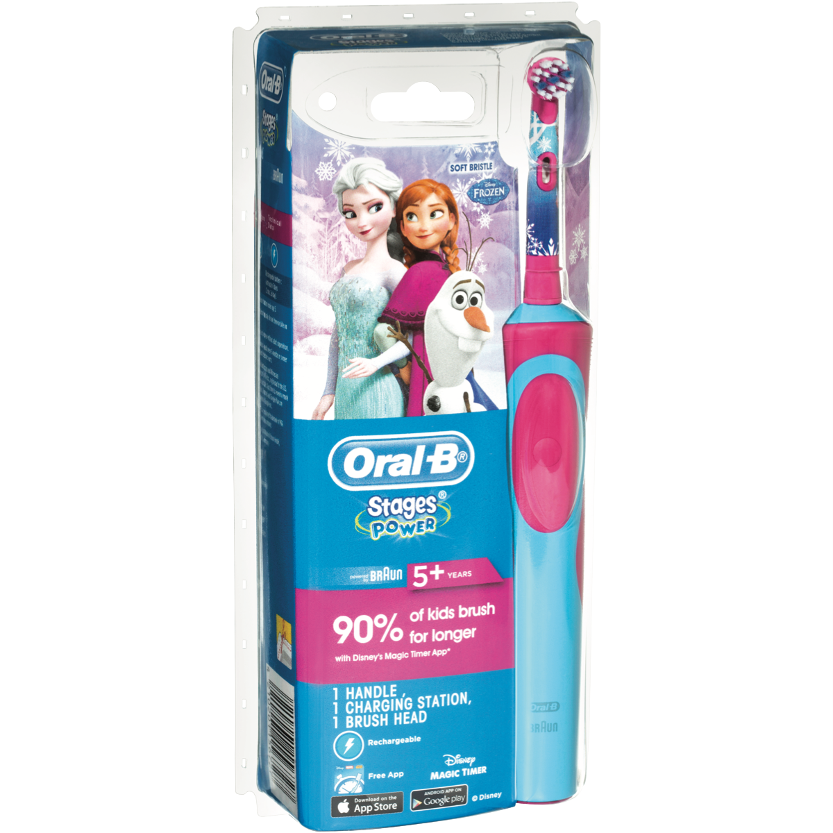 Bring fun and joy to your child's toothbrushing routine with the Oral B Vitality Kids Stages Frozen electric toothbrush. This rechargeable kids toothbrush features Bluetooth connectivity to the Oral-B kids disney magic timer app for interactive brushing guidance. With soft bristles gentle on young gums and a built-in timer it encourages proper brushing technique. The Frozen character design gives your child their favorite Disney pals to brush with. Compatible with all Oral B brush heads the Vitality Kids delivers vitality for your child's dental health. Backed by the Oral B name this electric toothbrush promotes healthy brushing habits. The manufacturer's part number for this product is VITALITYKFR. Give your child the gift of good oral care - order today.