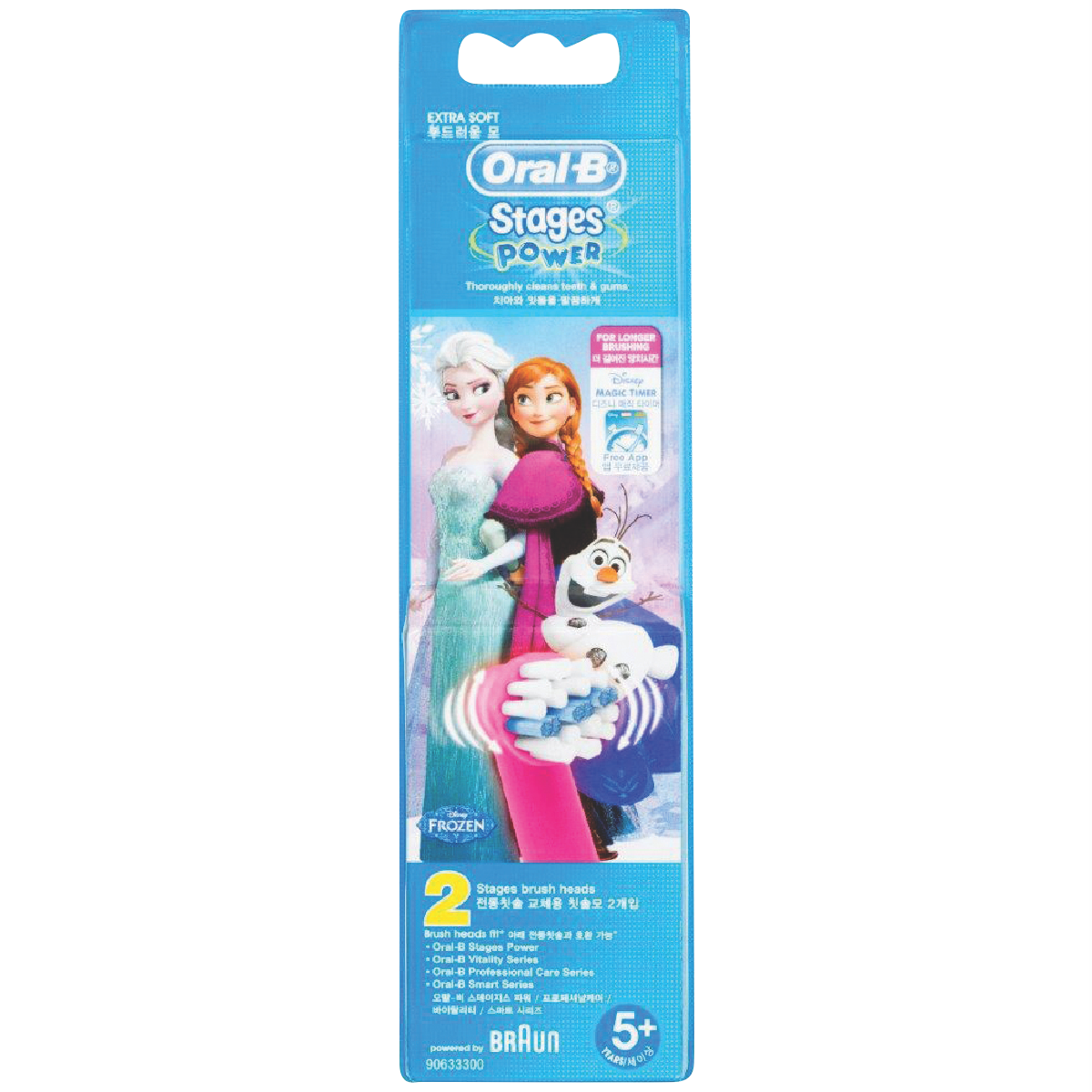 Bring Frozen magic and fun to your child's brushing routine with the Oral B Vitality Kids Stages Refill Frozen replacement brush heads. These soft gentle brush heads feature beloved Disney Frozen characters to make brushing a magical experience. The two included brush heads fit all Vitality electric toothbrushes providing a comfortable clean that's easy on young gums. With Oral B's stain removal technology the Frozen brush heads remove more plaque than a manual toothbrush for healthier teeth and gums. Give your child the gift of proper oral care with a toothbrush they'll look forward to using. Regular brush head replacements every 3 months ensure your child always has the most effective clean. The manufacturer's part number for this product is VITFRZNREFILL. Upgrade your child's oral hygiene today.