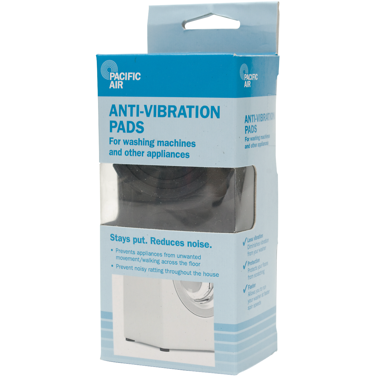 These Pacifica Anti Vibration Pads are a must-have for any laundry area. By absorbing vibration and securing your appliances they prevent unwanted movement and protect your floors from potential damage. With their anti vibration technology these pads diminish vibration from your washer allowing it to operate smoothly and quietly. Install them under your washer or dryer for enhanced stability. The anti slip rubber grips grab onto the floor while the durable pads cushion your appliances. Your laundry room will benefit from reduced noise and lessened vibrations. For peace of mind know that your washer or dryer is protected while your floors stay scratch-free. Give your laundry area an upgrade and install the Pacifica Anti Vibration Pads today. The manufacturer's part number for this product is AVP1. Consider adding these innovative pads for a laundry room that runs smoothly.