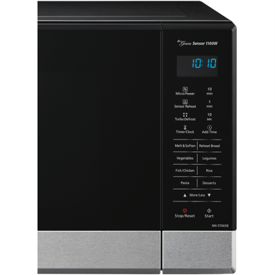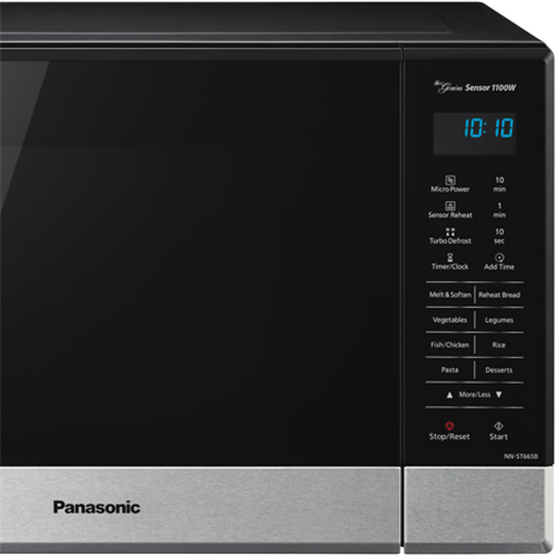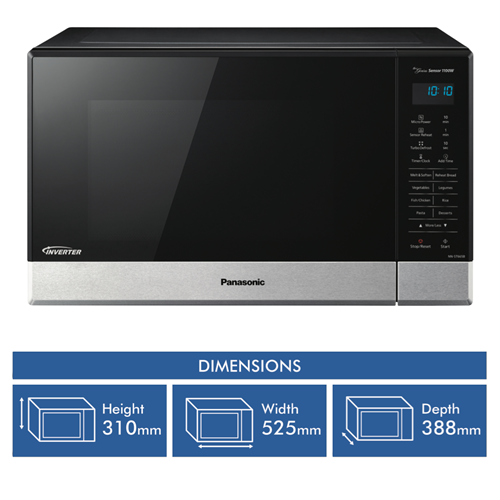 This 1100-watt Panasonic 32L microwave in sleek black stainless steel finish is the perfect addition to any modern kitchen. With a generous 32-litre capacity touch control panel and 11 auto cook menus you can quickly and conveniently prepare delicious meals for the whole family. The stylish black exterior and stainless steel door will complement any décor. The touch pad allows for easy selection of functions like defrost child lock and the large 340mm turntable means you can fit in multiple dishes. Measuring 52.5cm wide x 31cm high x 38.8cm deep this compact microwave can fit on countertops or built in. The intuitive controls and auto cook menus take the guesswork out of microwave cooking. Prepare perfect roasts vegetables pizza pasta and more with a simple touch. Defrost frozen foods without any hassle. The black stainless steel ensures durability and easy cleaning. With a 1 year warranty you can purchase with confidence. The manufacturer's part number for this product is NN-ST665BQPQ. See how convenient microwave cooking can be with the Panasonic 32L 1100W microwave.