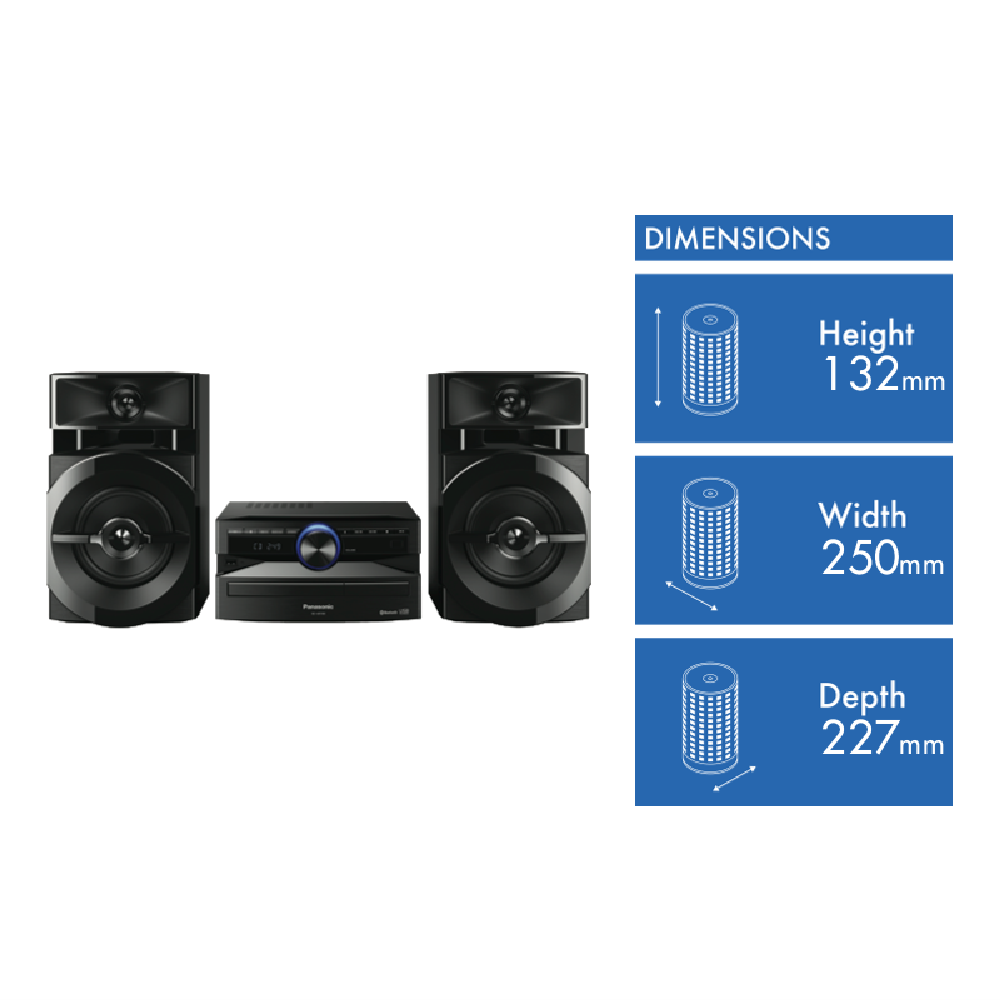 This Panasonic stereo features a 300 W total output and a Bluetooth connection. The UX100 delivers powerful bass and comes in a matte finish to suit any space. Stream your favourite tunes from your smartphone or tablet by the MAX Juke App as this Panasonic stereo has Bluetooth. You can have the sound system you've always wanted without worrying if it'll fit in your room with this Panasonic stereo.