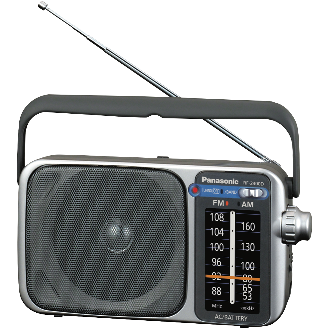 Tune in and enjoy your favorite radio stations on the go with the Panasonic Portable Radio AM/FM. This lightweight silver radio delivers clear sound through its 10cm full range speaker and packs 770mW of total output power. With one-touch station presets automatic frequency control and a convenient tuning LED finding and listening to your preferred stations is a breeze. The sleek compact design makes it easy to take this radio anywhere. Powered by 4 AA batteries (included) you'll get hours of entertainment whether at home work or on the road. At just 0.690kg and measuring 122mm x 234mm x 82mm the Panasonic Portable Radio AM/FM is the perfect portable audio companion. Backed by a 1 year manufacturer's warranty this durable radio provides reliable performance you can count on. Rediscover the simple joy of radio with the Panasonic Portable Radio AM/FM. The manufacturer's part number for this product is RF-2400DGN-S. Learn more about this versatile portable radio today.