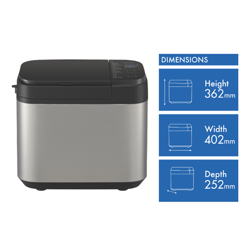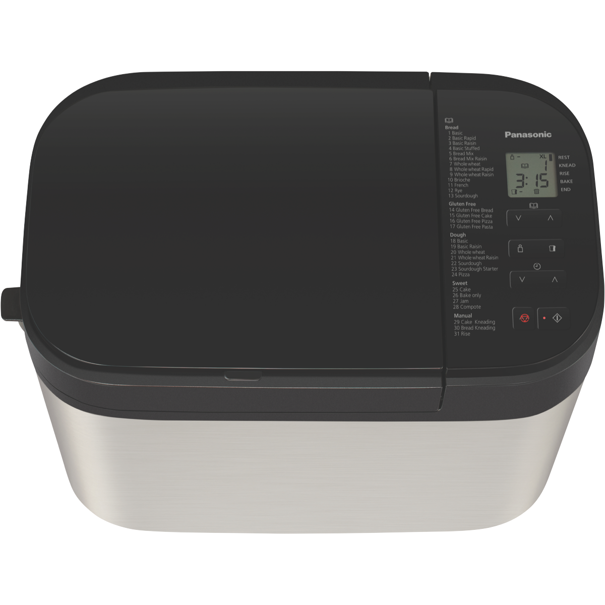 Discover the joy of homemade bread with the Panasonic Stainless Bread Maker. This versatile appliance offers an array of 31 auto menus for effortless baking including options for sourdough brioche rye cakes dough and more. The diamond fluorine coated inner pan releases baked goods easily while dual temperature sensors ensure optimal conditions. With a 13 hour digital timer 4 gluten-free settings and automatic dispensers for yeast raisins and nuts unleash your creativity. Craft artisanal loaves up to 2kg with customized crust colors and sizes. The sleek stainless steel exterior houses a 7.5kg body standing 362mm tall 402mm wide and 252mm deep. Visualize waking up to the aroma of fresh bread with customized crusts and flavors. The manufacturer's part number for this product is SD-YR2550SST. Bring the magic of a bakery into your own kitchen today.