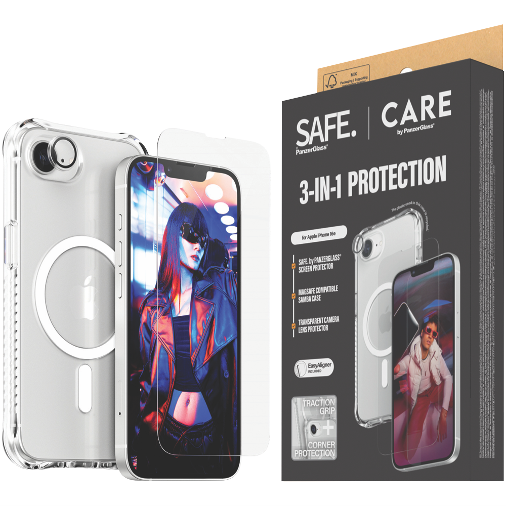 This Panzer Glass 3-in-1 Bundle is a handy kit for your iPhone 16e. It's got everything you need to keep your phone safe and looking good. The bundle includes a screen protector case and camera lens protector. It's made to fit perfectly on your iPhone 16e and it even works with some other iPhone models like the 14 13 and 13 Pro. The ultra-wide fit with aligner helps you put it on just right. Plus you get peace of mind with a 1-year warranty from the manufacturer. The part number for this bundle is CRNCHFUG29845. *Phone Not Included