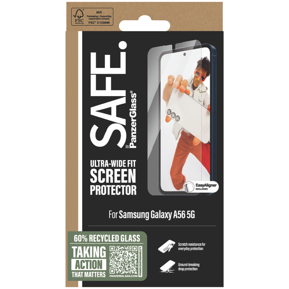 60% recycled glass = Same strength. Circulation solution. This screen protector is made of 60% recycled glass. FSC -certified packaging. Comes in a box made of recyclable FSC -certified paper. Ultra-Wide Fit = Covers the entire front surface of your device to provide a complete and clear view of your screen while still leaving room for a case. Drop protection = Protects against crushing falls onto stone-hard pavements unforgiving bathroom floors and other device-smashing surfaces. Scratch resistant = Protects your device from scratching caused by the hazards of everyday life. Shock resistant = Keeps your device safe from your everyday fumbling dropping and screen cracking. Easy installation = So easy to install you can do it even if you re all thumbs. Longer lifespan = Extends the lifetime of your device enabling you to enjoy it longer and give it to others when you no longer need it yourself. 100% touch sensitivity = Feels like the original screen with 100% touch sensitivity. Includes EasyAligner = Comes with an EasyAligner that makes installation so simple you can do it perfectly even if you re all thumbs. Crystal-clear view = So clear that you might not even notice it's there well not until your device tumbles to the ground and your screen doesn't crack. Fingerprint resistant = Repels oil and water reducing traces of fingerprints as well as dirt disinfectant gel and hand lotion. Case friendly = Keeps your screen safe while still leaving room for a protective case.
