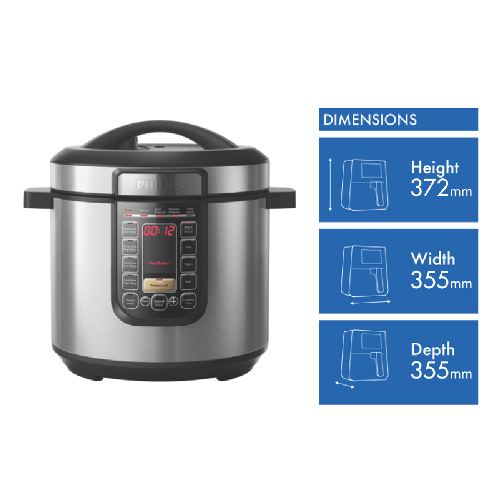 Take your cooking to the next level with the versatile Philips All-In-One Cooker. This multicooker in sleek silver makes meal prep a breeze with 16 smart programs including slow cook pressure cook sear and keep warm. The 6L capacity is perfect for cooking family-sized portions. It heats up 25% faster and has a ProCeramic-coated pot for even heating and easy cleaning. With intuitive controls and a handy LED display you'll master every recipe. The 9 safety features give you peace of mind. Whip up stews curries risottos and more with the touch of a button. Sear meats to lock in juices before pressure or slow cooking. The auto keep warm function holds your meal at the perfect temperature for up to 12 hours. This multicooker has 1300W of power and comes with a recipe booklet to inspire your cooking. Give your dinners an upgrade with the Philips All-In-One Cooker. The manufacturer's part number for this product is HD2237/72.