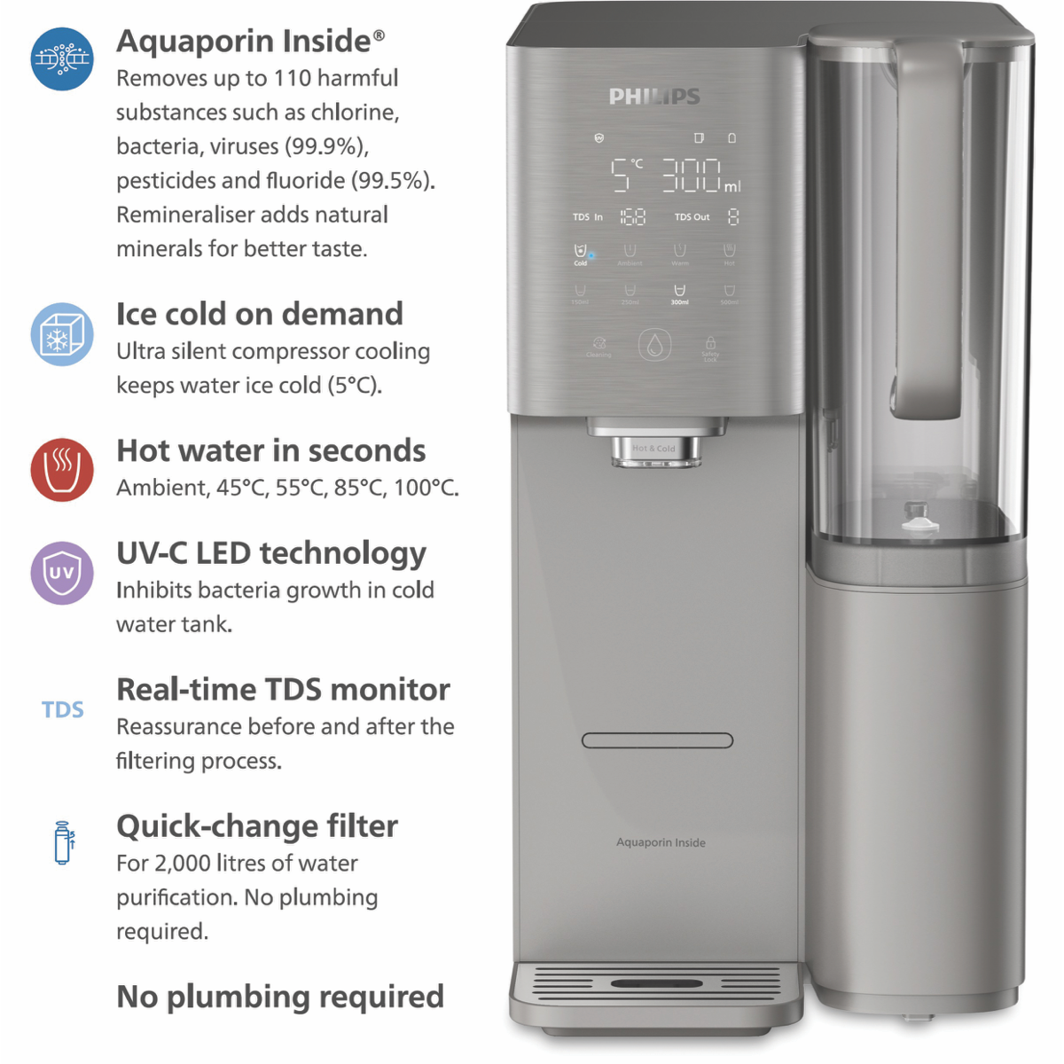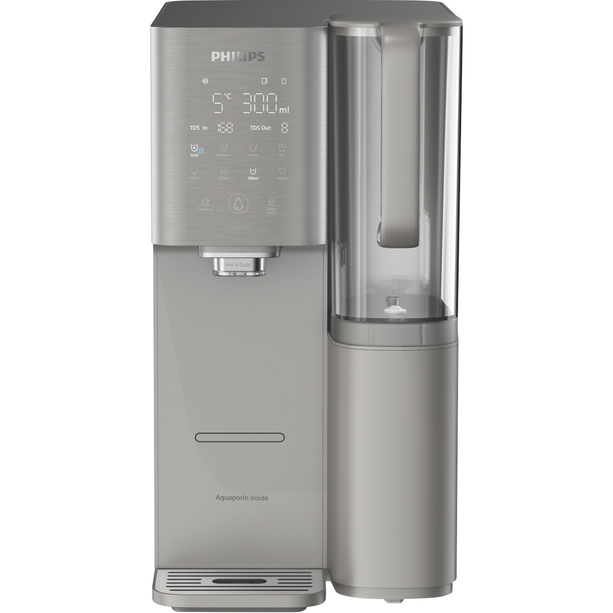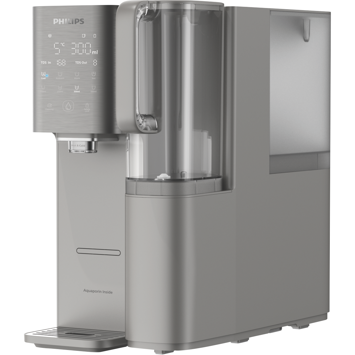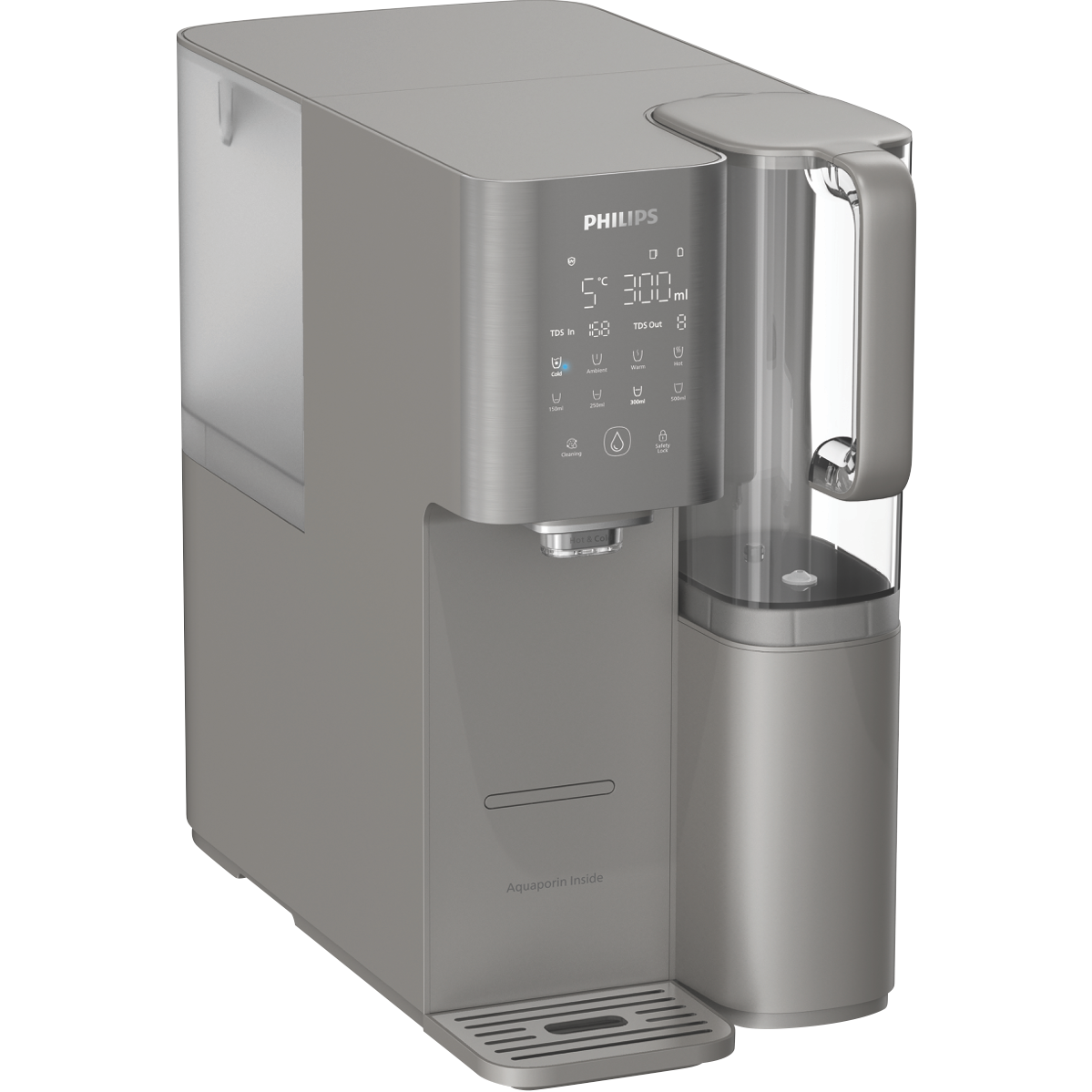 Quench your thirst with the latest in water filtration and customization with the Philips Aquaporin Mineral RO Water Station. This innovative grey water station provides chilled ambient or piping hot water on demand through advanced UV-C LED technology. With a generous 6L total capacity and 1.8L filtered water tank you'll always have cool clean water ready. The intuitive display lets you know your water's quality at a glance. Six precise temperature settings from 45°C to 100°C mean you can enjoy coffee tea or a refreshing glass of water just the way you like it. The compact 230mm x 420mm x 424mm size fits perfectly on your countertop without clutter. Experience the difference purified water makes; this Philips water station can enhance your health through improved hydration and reduced impurities. It also makes cleaning a breeze thanks to the advanced filtration and antimicrobial materials. Invest in long-term water health for your family with the Philips Aquaporin Mineral RO Water Station today. The manufacturer's part number for this product is ADD6921DG/79. Learn more about the benefits of purified water; inquire now about this innovative Philips water station.