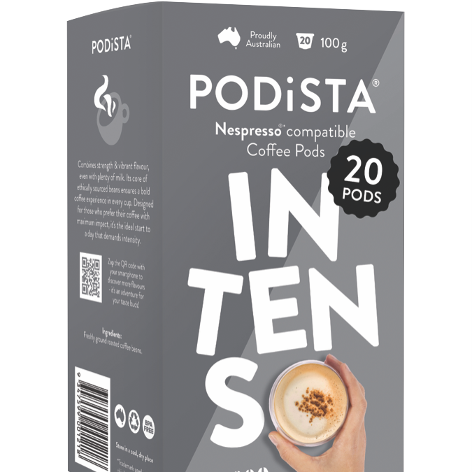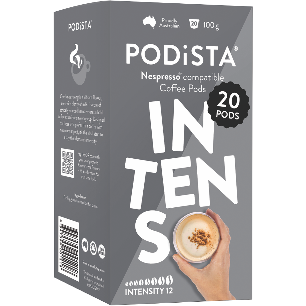 Start your mornings in style with the PODiSTA Intenso coffee pods. These Italian-style coffee capsules are designed for rich robust flavor in every cup. The Intenso pods contain a specially blended dark roast coffee crafted to deliver a bold taste with hints of cocoa and toasted nuts. Pop one of these intense coffee capsules into your compatible pod machine and enjoy a premium coffee shop experience from the comfort of home. With 20 capsules per pack you'll have plenty of intense coffee on hand for busy mornings or afternoon pick-me-ups. The rich crema and full-bodied flavor of Intenso will satisfy any coffee lover. Upgrade your daily cup and experience the intensity of PODiSTA Intenso coffee pods today. The manufacturer's part number for this product is 200057. Discover the convenience and taste of PODiSTA Intenso coffee capsules.