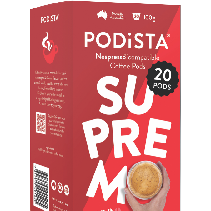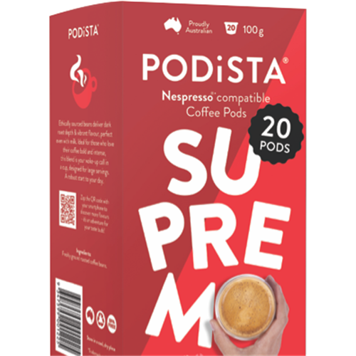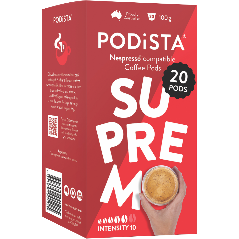 Satisfy your coffee cravings with the PODiSTA Supremo Coffee Pods 20pk. These convenient coffee capsules deliver rich aromatic espresso with every cup letting you enjoy barista-quality coffee from the comfort of home. Simply pop a capsule in your compatible coffee machine for a smooth shot of espresso bursting with flavor. With no mess or fuss you can brew a delicious cuppa in seconds. The aluminum capsules preserve freshness and aroma while being fully recyclable. Treat yourself to a premium coffee experience with the ease and speed of PODiSTA's single-serve coffee pods. The manufacturer's part number for this product is 200058.