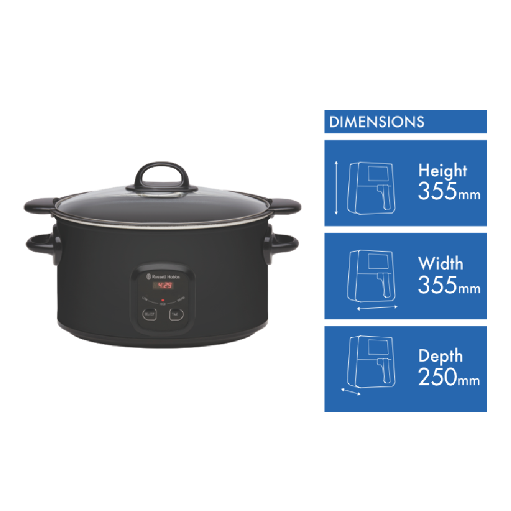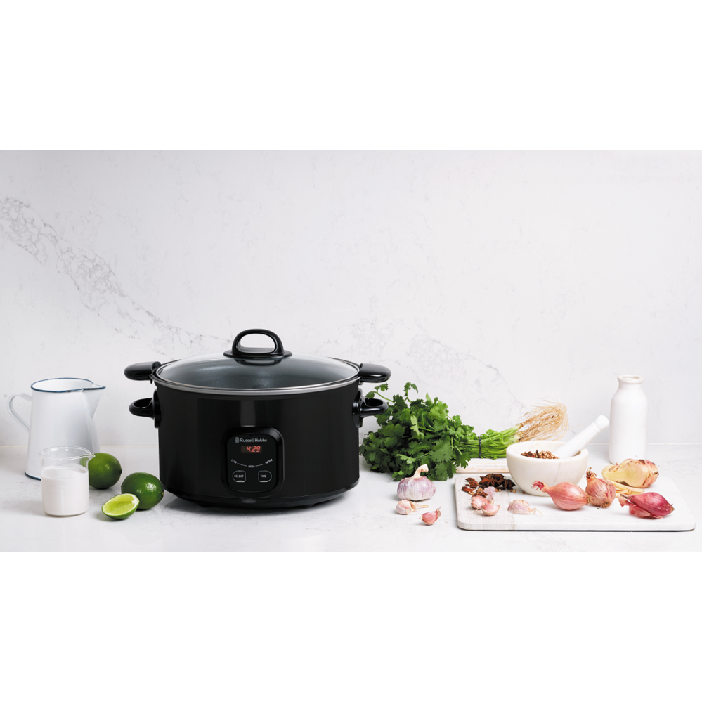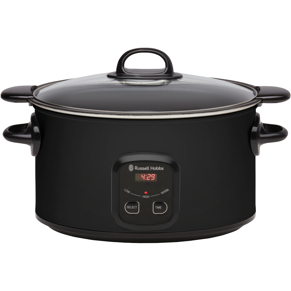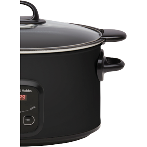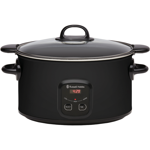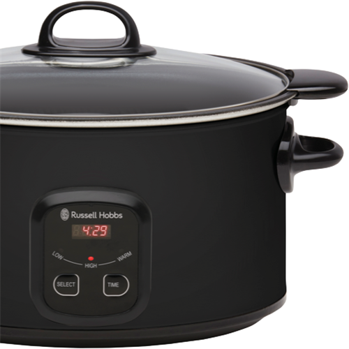 Step up your slow cooking game with the versatile Russell Hobbs 6 Litre Searing Slow Cooker in stylish matte black. This multi-functional cooker lets you sear meats to lock in flavour and moisture before switching to low slow cooking. The generous 6 litre capacity caters to gatherings while the tempered glass lid allows monitoring without lifting it and releasing heat. Program cooking times up to 24 hours on the digital controls and timer for perfect results every time. The wrap-around heating element distributes heat evenly ensuring food is cooked through without hotspots. With settings for high low and keep warm this Russell Hobbs slow cooker simplifies cooking tender roasts stews curries and more. The non-stick cooking pot cleans up easily when the festivities are over. Compact yet powerful this 2.7kg slow cooker brings delicious simplicity to your countertop. Russell Hobbs supports this product with a 2 year warranty so you can cook with confidence. The manufacturer's part number for this product is RHSC650BLK. Consider the Russell Hobbs 6 Litre Slow Cooker for easy flavourful meals.