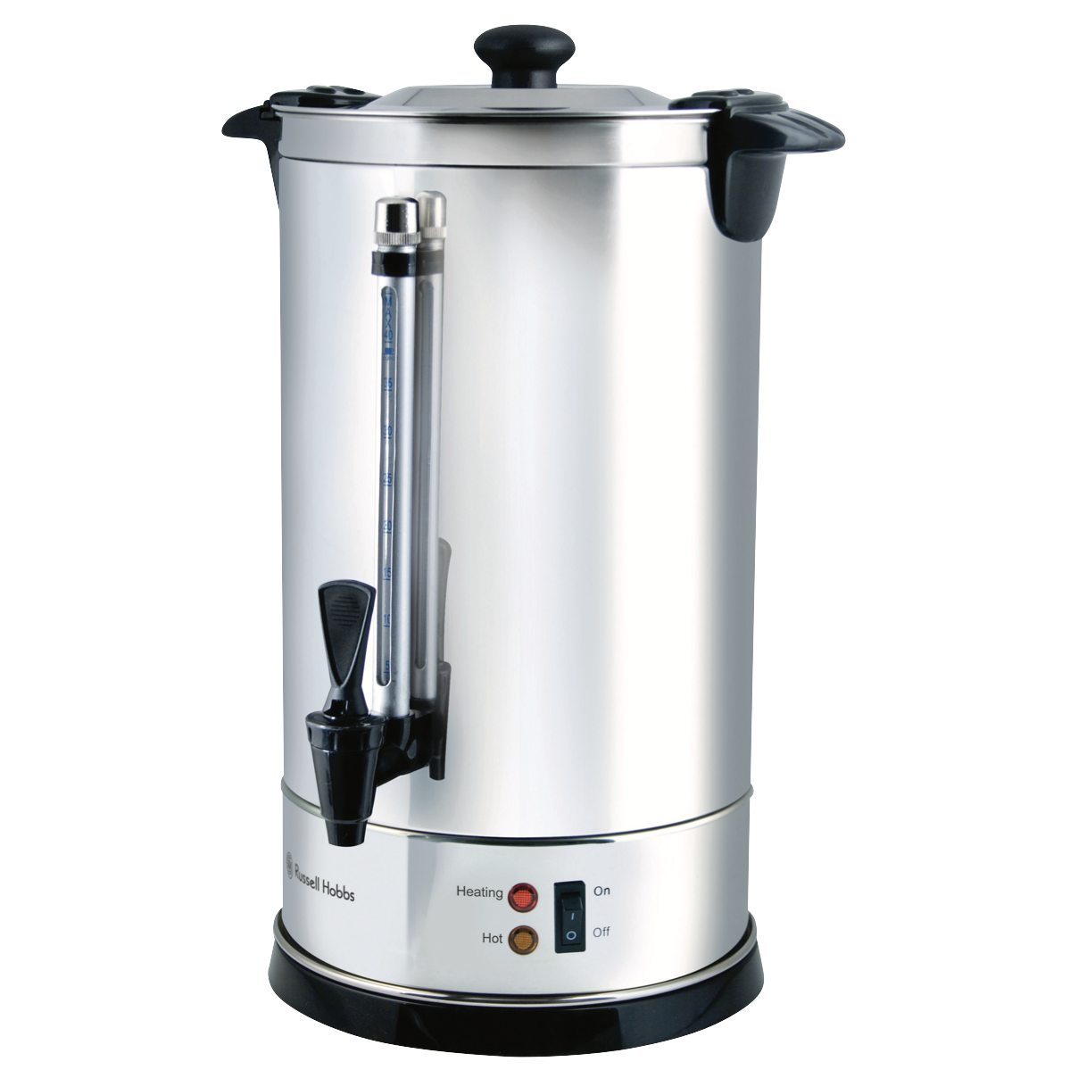 This 8.8litre Russell Hobbs urn holds up to fifty 150ml cups of boiling water so it s perfect for life s celebrations and home-catered occasions. It has a cool touch lid knob cool touch handles twist lock lid with steam tent boil dry protection and multidirectional non-drip tap for safety. It also has two lights that indicate when the water is heating and hot double wall insulation a water window so it s easy to see when the water needs to be refilled and comes with a two-year manufacturer s warranty. With 1300W of power and a keep warm function this chic stainless steel and black Russell Hobbs urn adds style to any occasion and makes fifty cups of tea coffee and hot chocolate so easy.