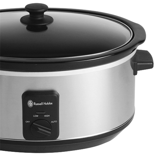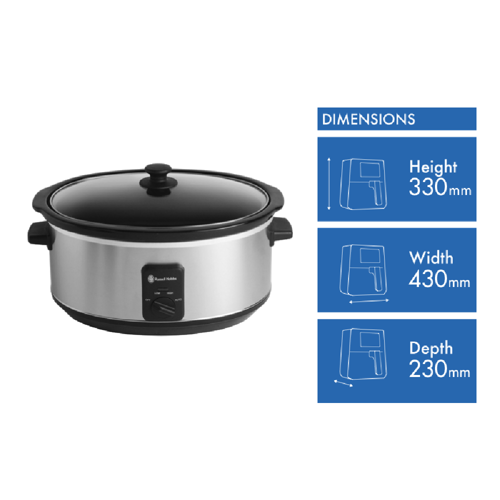 Experience the ease of slow cooking with the Russell Hobbs 6L Slow Cooker. This stainless steel slow cooker features a generous 6 litre ceramic pot and tempered glass lid allowing you to cook delicious one-pot meals for the whole family. With manual dials and indicator lights operation is simple. Set it to high or low and let the double heating element do the work. The auto mode is perfect for set and forget; it starts cooking on high then automatically switches to low once the contents are heated through. The cool touch handles ensure safe handling while the tempered glass lid locks in flavour. At 320W this 320mm wide 240mm high and 300mm deep slow cooker is an ideal size for soups stews curries and more. Weighing 5.6kg the Russell Hobbs 6L Slow Cooker makes cooking low and slow meals effortless. With a 2 year manufacturer's warranty this is a quality kitchen companion. The manufacturer's part number for this product is RHSC600. Give your dinners a delicious slow-cooked flavour without the fuss and add the Russell Hobbs 6L Slow Cooker to your cart today.