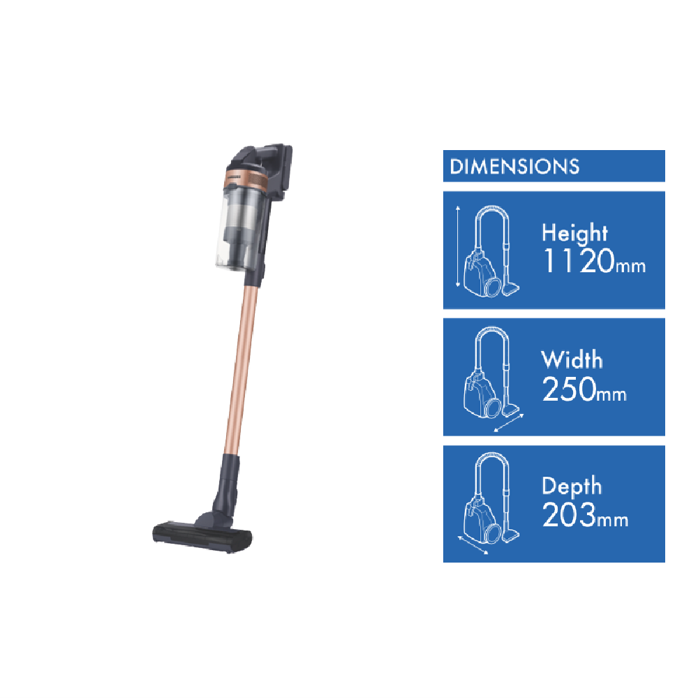 Powerful cleaning performance 150W Suction(1) Designed to effectively capture dust and hair on multiple-surfaces the Digital Inverter Motor can generate up to 150W of suction1. Additionally 9 Jet Cyclones and 27 air inlets help reduce suction loss and trap fine dust. No need to rush while vacuuming! A high-efficiency battery maintains suction for up to 40 minutes(2) of uninterrupted cleaning. You can even double your cleaning time without recharging - simply replace the battery in use with a spare one(4) and extend your cleaning time to up to 80 minutes.2-in-1 Charging Station Store and charge your vacuum cleaner flexibly with the 2-in-1 Charging Station. It can be easily mounted on the wall to save space or used as a stand-alone charger with the removable battery. Enjoy efficiency and long lasting performance. The Digital Inverter Motor s ultrasonic welded airfoil blades help optimise airflow and is backed by a 10 years limited parts warranty(3) to give you peace of mind. Weighing at just 2.3kg the lightweight cordless design helps you move swiftly and reduce wrist strain while you clean hard-to-reach areas. With a five-layered filtration system the Jet 65 Pet Stick Vacuum can trap up to 99.999%(5) of dust(6) helping to prevent release back into the air. Disclaimers: (1)Based on internal testing in accordance with the IEC 62885-4 CL.5.8 standard. Measured at the inlet of the non-accessorized tool using Jet Mode and a battery that is fully charged. Results may vary depending on actual usage.(2)The stated run time applies when using a high capacity battery (2000mA) and the minimum power level with a non-motorized tool attached. Results may vary depending on actual usage (3)See warranty Card or visit www.samsung.com.au for details (4)Spare batteries and additional accessories sold separately. (5)Based on internal testing in accordance with the IEC 62885-4 CL.5.11 standard using the Jet mode. Results may vary depending on actual usage.(6)Refers to dust particles in the size range of 0.5 to 4.2µm