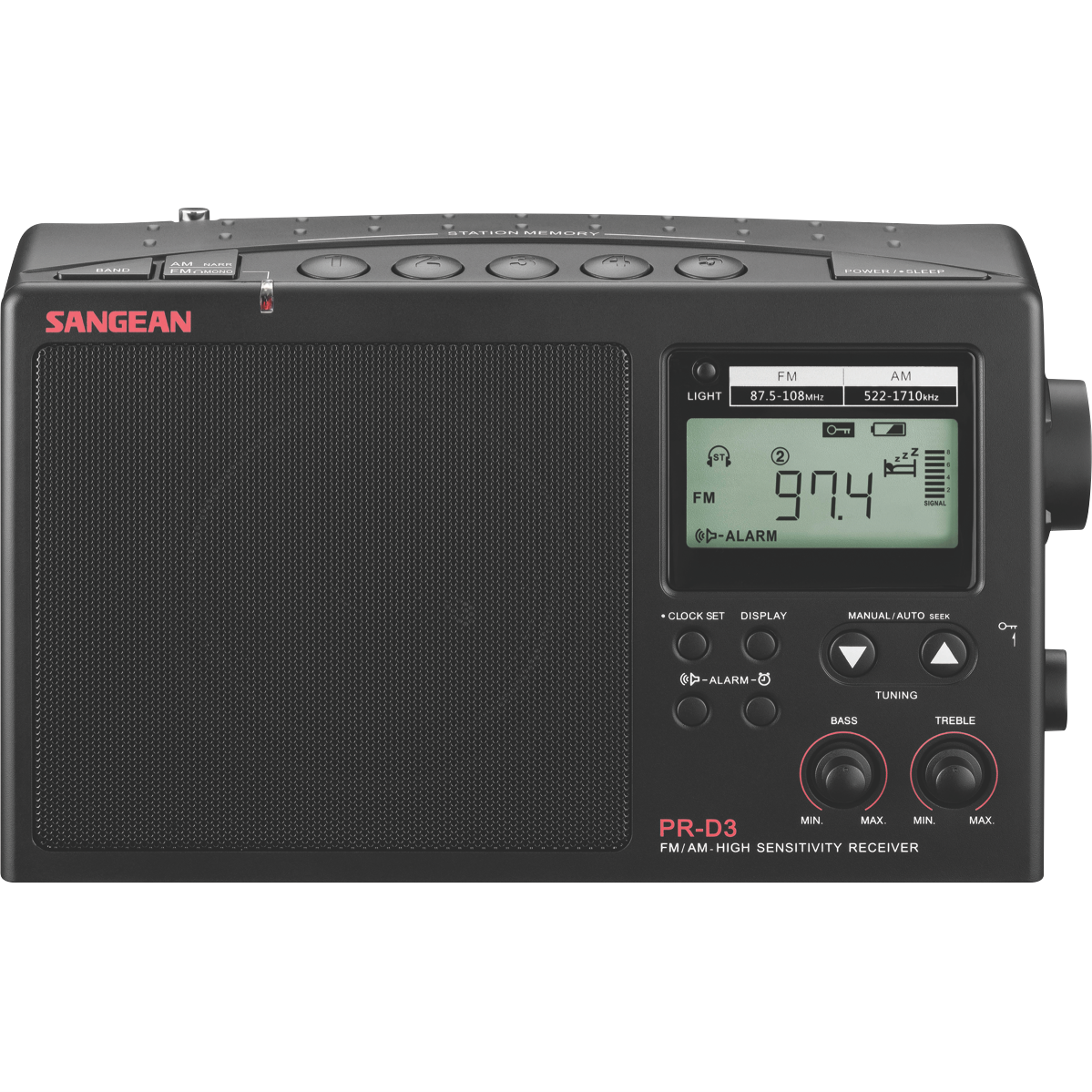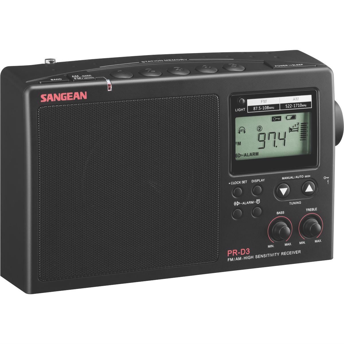 Additional Features 200mm Bar Antenna with Tracking-less Technology, Easy-to-Read LCD display with Backlight, Alarm Timer by Buzzer or Radio