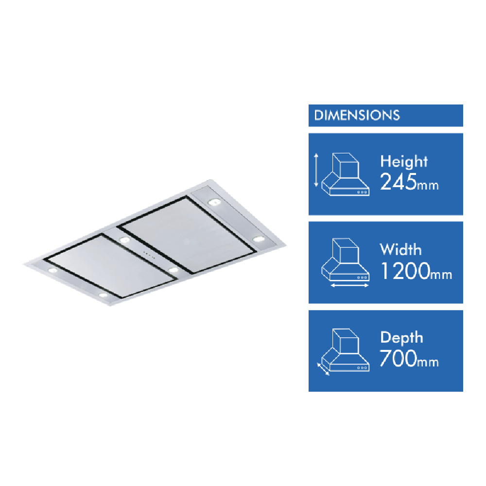 The stainless steel Schweigen 120cm Silent Ceiling Cassette Rangehood UM4220-12SP2 offers excellent coverage over island or peninsula style kitchen benches. You can quietly eliminate smoke and moisture with its 3000 cu m/hr extraction capacity. It has multiple LED lights to illuminate brightly over your creations. With the technology of Perimeter Aspiration airflow is targeted towards the edge of the cassette creating a more intense extraction area. Perfect for maintaining uninterrupted views with its installation flush into the ceiling or bulkhead this Schweigen rangehood accentuates any modern kitchen design.