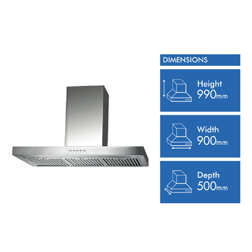 Transform your kitchen with the sleek modern design of the Smeg 90cm Canopy Rangehood. With a stunning stainless steel finish and LED lighting this wall-mounted canopy adds style and illumination while keeping your air fresh and clean. The powerful 900m3/hr extraction capacity swiftly eliminates steam grease and odours through centrifugal action and dishwasher safe aluminium filters. Convenient push button controls allow you to adjust between three quiet fan speeds up to 62 dBA for focused ventilation when cooking. Ducting keeps the air flowing outside your home. With a width of 900mm height of 990mm and depth of 500mm this rangehood makes an imposing statement in any kitchen. Smeg's trusted quality includes a 2 year warranty for peace of mind.Bring the wow factor to your cooking space with this visually striking and highly functional canopy rangehood. The manufacturer's part number for this product is SA980CXA. Check out this must-have kitchen upgrade today.