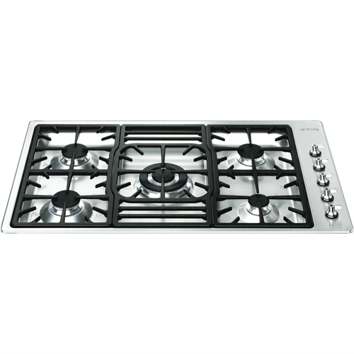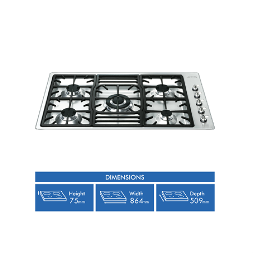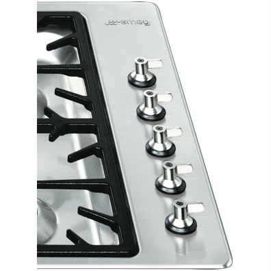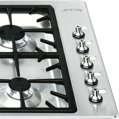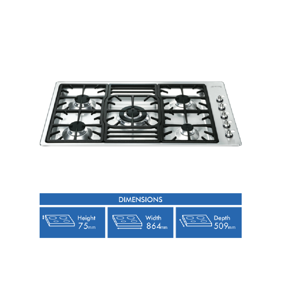Step up your cooking game with the powerful yet stylish Smeg 90cm 5 Burner Gas Cooktop. This stainless steel beauty will be the centerpiece of your kitchen with its sleek aesthetic and ultra-efficient burners. Cook like a pro with the triple ring ultra-rapid burner that delivers an intense 18500 BTU heat output for searing stir frying and boiling. Three semi-rapid burners give you precise control with up to 9500 BTU while the handy auxiliary burner is perfect for simmering sauces or keeping food warm. The durable cast iron trivets protect your cooktop and support all your pots and pans. With automatic ignition and flame failure safety device this Smeg cooktop combines performance with peace of mind. Whip up restaurant-quality meals at home with 5 ultra-responsive gas burners sleek stainless steel finish and powerful output up to 18500 BTU. This 90cm wide cooktop will be the high-performance heart of your kitchen. Visualize sizzling steaks boiling pasta and simmering sauces with this versatile and safe 5 burner gas cooktop from Smeg. The manufacturer's part number for this product is PGA95-4.