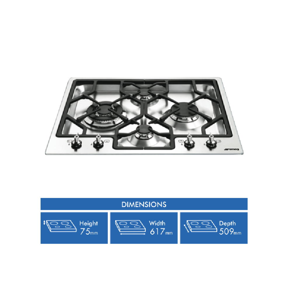 Transform your cooking experience with the Smeg 60cm Gas Cooktop PGA64. This sleek stainless steel cooktop boasts four burners including two auxiliary one rapid and one ultra-rapid wok burner giving you the flexibility to create a variety of culinary delights. The cast iron trivets provide a sturdy base for your pots and pans while the automatic ignition and knob controls make operation a breeze. Safety is paramount with the flame failure safety device ensuring peace of mind while you cook. Measuring 617mm wide 75mm high and 509mm deep this cooktop is designed to fit seamlessly into your kitchen. The Smeg PGA64 comes with a 2-year manufacturer's warranty and includes an LP gas conversion kit for added convenience. Elevate your cooking game with this stylish and functional gas cooktop from Smeg.