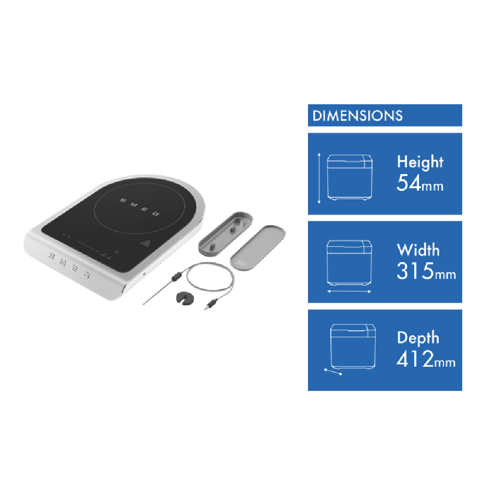 Want to cook like a pro without the hassle? Meet the Smeg Portable Induction Cooktop in sleek matte white. This compact powerhouse packs 1450W - 2100W of cooking power into a brushed aluminium and black ceramic glass design that looks great on any countertop. With 9 power levels a boost function and specialized programs for BBQ frying keeping food warm and more you can tackle any recipe. The included temperature probe and clip let you monitor your dishes with precision. Safety features like automatic cut off and pan detection give you peace of mind. When you're done the acoustic alarm and residual heat indicators keep you informed. Measuring just 54H x 315W x 412D mm it's the perfect size for any kitchen. Plus it comes with a 2-year manufacturer's warranty for extra assurance. Ready to elevate your cooking game? Check out the Smeg PIC01WHMAU portable induction cooktop.