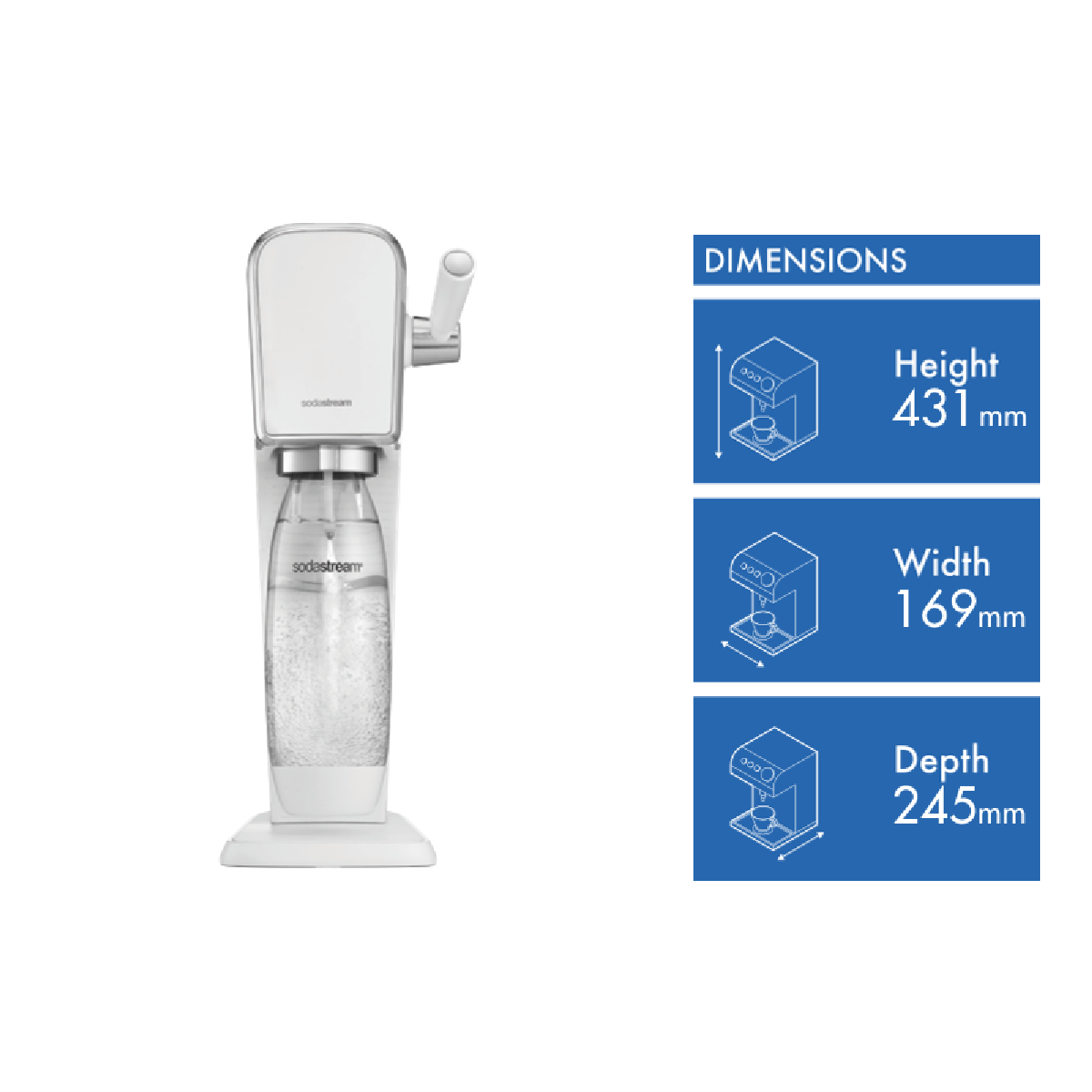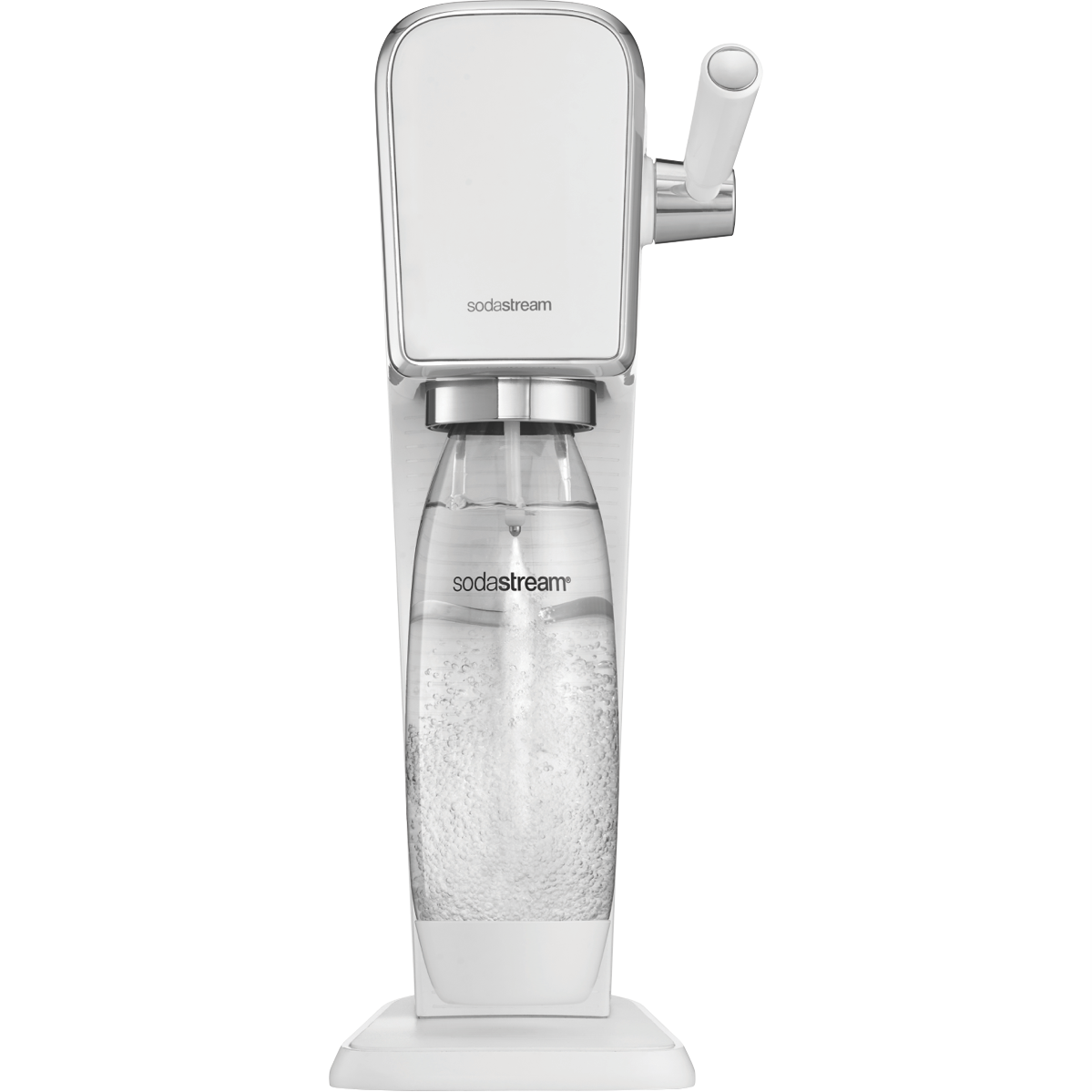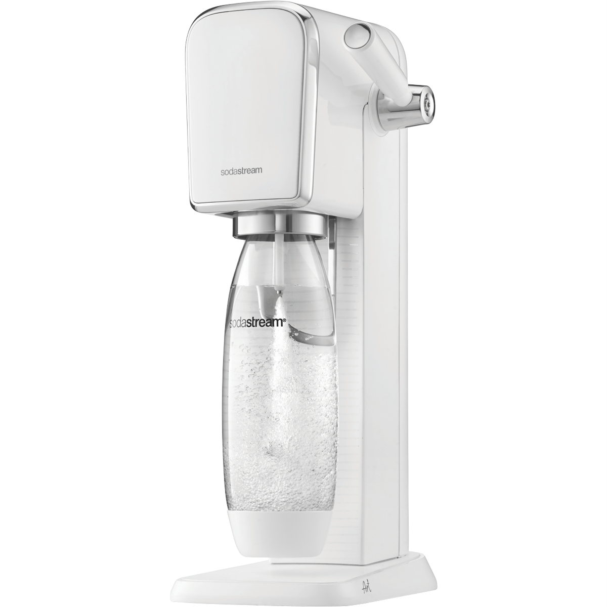 Fizz your water in style with the Sodastream Art White Sparkling Water Maker 1013511610. The Art comes with Sodastream's amazing Quick Connect gas cylinder installing with just one click from inserting no twisting required. Sink into the Spark Design Awards winning design with stainless steel trimmings and precise control thanks to a retro carbonating lever. Easily fit it anywhere around the house thanks to cordless operation and an included dishwasher safe bottle means clean up is easy. Soda your own cordials iced teas syrups and more*. * Disclaimer: Sodastream makers only support the carbonation of water into soda water with syrups/mixers added afterwards. Do not attempt to carbonise other liquids in Sodastream makers.