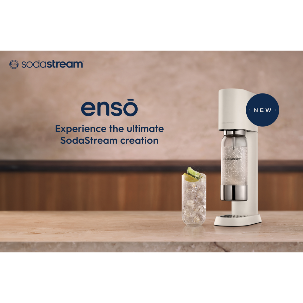 Transform tap water into sparkling drinks with the elegant Enso Sand Sparkling Water Maker. Elegantly crafted from high-quality materials and designed by Naoto Fukasawa this 1L capacity maker features a CO2 Cylinder Quick Connect System for easy setup. The unique Snap & Lock technology makes bottle attachment and release simple while the stainless steel carbonation nozzle ensures optimal hygiene. Your purchase includes a dishwasher-safe carbonation bottle so you can enjoy fresh sparkling water anytime. Comes with a 2-year manufacturer's warranty. Model 1013601612.