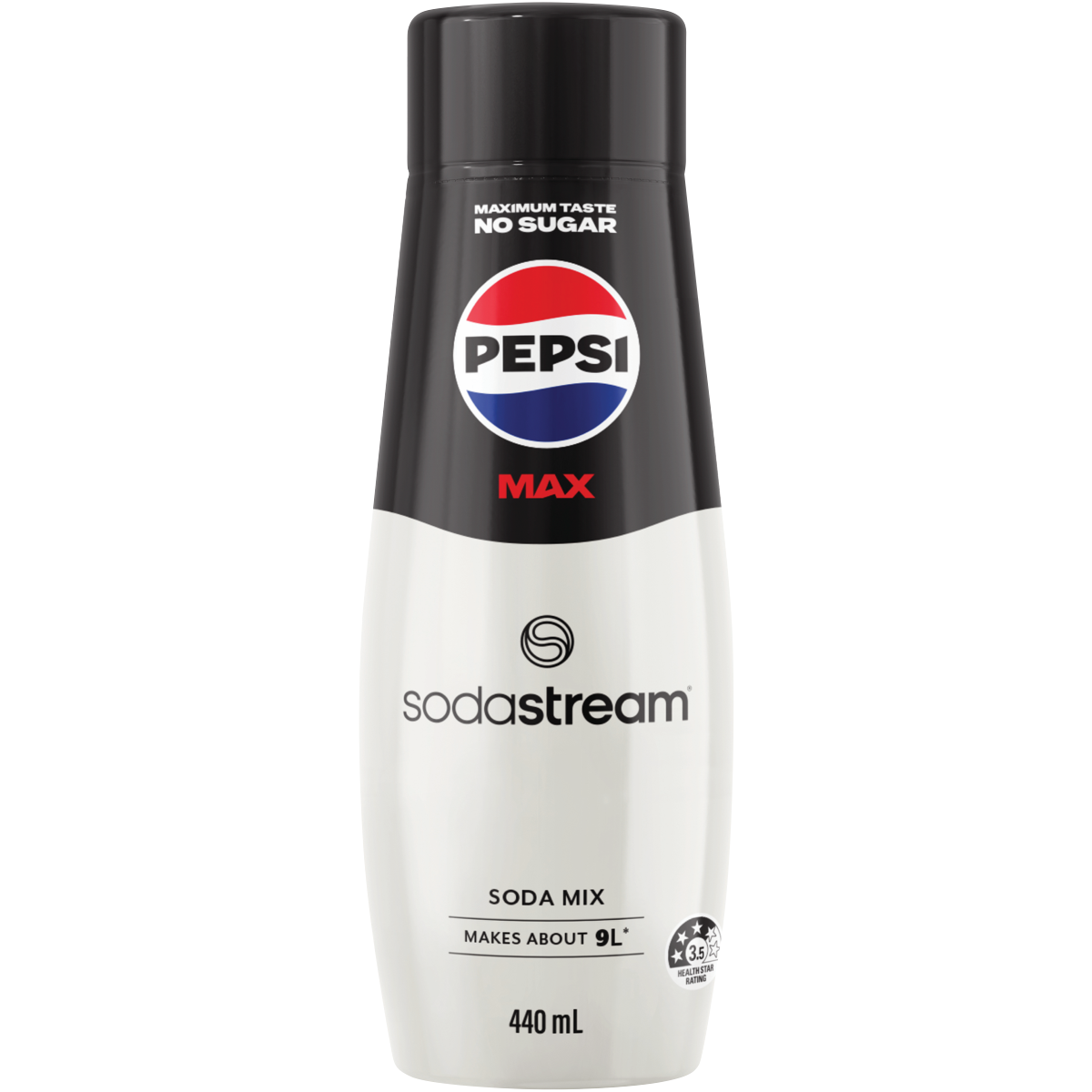 Quench your thirst with the refreshing taste of Pepsi Max now available in a convenient Sodastream syrup. This 440ml bottle of concentrated Pepsi Max flavoring is designed specifically for use in Sodastream machines allowing you to add bubbles and create up to 9 litres of your favorite soft drink at home. With Sodastream and Pepsi Max syrup you can avoid lugging heavy bottles and cans from the supermarket while still enjoying the crisp sugar-free flavor you love. Simply add the Pepsi Max concentrate to your Sodastream machine as directed then push the button to carbonate and enjoy an ice-cold glass of Pepsi Max anytime. This Sodastream Pepsi Max syrup brings the genuine taste you expect from Pepsi in a format that lets you customize your bubbly beverage just the way you like it. Make a single serving to sip or mix up a pitcher for the whole family - the options are endless with Sodastream Pepsi Max syrup. Stay refreshed all day long without the calories and guilt of sugary soft drinks.The manufacturer's part number for this Sodastream Pepsi Max syrup is 1924202610. Check out Sodastream Pepsi Max syrup today to enjoy the Pepsi taste you love with the convenience of making it fresh at home.