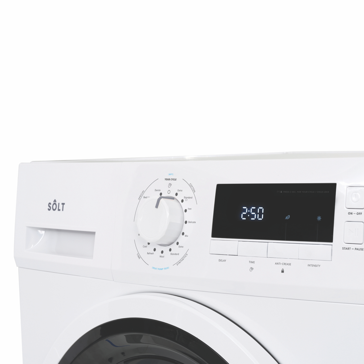 Discover a life-changing laundry experience with the Solt 8kg Heat Pump Dryer. This innovative 7 star energy rated clothes dryer is designed to be gentle on fabrics while maximizing energy efficiency. With its generous 8kg drying capacity you can refresh even the largest of loads with ease. The advanced heat pump technology draws moisture away from clothes without relying solely on heat protecting fabrics from over-drying. Choose from 16 specialized drying programs like Cotton Synthetic Wool and Sports wear to customize cycles for any garment type. Additional features such as the 24 hour delay start option anti-crease function and reverse tumbling showcase the thoughtfulness put into this dryer. Installation is simplified with the ability to stack the 595mm wide x 845mm high x 650mm deep body on top of a washing machine. Bring exceptional fabric care and smart technology into your laundry room with the Solt 8kg Heat Pump Dryer today. The manufacturer's part number for this product is GGSHPD800W. Discover if this is the dryer for you by learning more now.