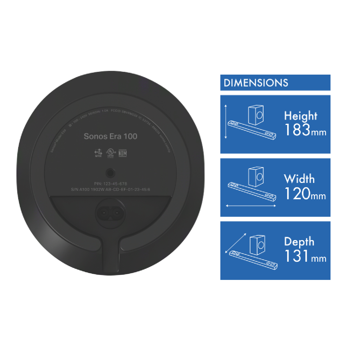 With its sleek black design the Sonos Era 100 wireless speaker will fill any room in your home with rich immersive sound. This Bluetooth and Wi-Fi enabled speaker effortlessly streams all your favorite music podcasts and more from services like Spotify Apple Music and Amazon Music. Controlled completely through the Sonos app the Sonos Era 100 allows you to listen to different songs in different rooms or group multiple speakers together for a multi-room listening experience. The speaker's capacitive touch controls let you easily play pause or skip tracks right on the device. Designed to withstand humidity this durable speaker can be used in the bathroom or outdoors. And with built-in Amazon Alexa and Apple AirPlay 2 compatibility you can use your voice to operate the speaker hands-free. So whether you're hosting a dinner party or just relaxing at home the Sonos Era 100 speaker delivers bold balanced audio and seamless wireless connectivity. Let this sleek smart speaker fill your home with music you'll love. The manufacturer's part number for this product is E10G1AU1BLK. Bring home rich immersive sound with the Sonos Era 100 today.