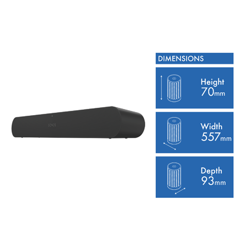 Bring your home entertainment experience to life using the Sonos Ray RAYG1AU1BLK the brilliant designed and high quality soundbar. Bring friends around for the perfect movie night or just delve into the amazing acoustic rhythms on your own thanks to the support of Hollywood's award-winning sound engineers. Listen to seamless precise harmonies and impactful clean bass with Sonos's custom acoustics proprietary anti-distortion technology. Split waveguides projects sound that reflects from wall to wall to immerse the viewer right in the middle of the action. The Sonos Ray always produces the best soundscape via the integrated Trueplay tuning technology; it adapts to your living space so the audio is always perfect for the area you are in(1). The Sonos Ray can always be placed in tight or narrow areas without impacting of sound quality; acoustic elements face forward so it projects towards the listener and not towards places that can cause interference. Stress less when setting up the Sonos Ray its intuitive construction offers a simple plug in and connect method with the Sonos App doing the rest of the work for you. Listen to music podcasts radio and all your favourite content all day through your local Wi-Fi connection and a range of compatible premium streaming and audio services including Spotify Connect Apple AirPlay 2 and the Sonos app. (1) Supported iOS device required.