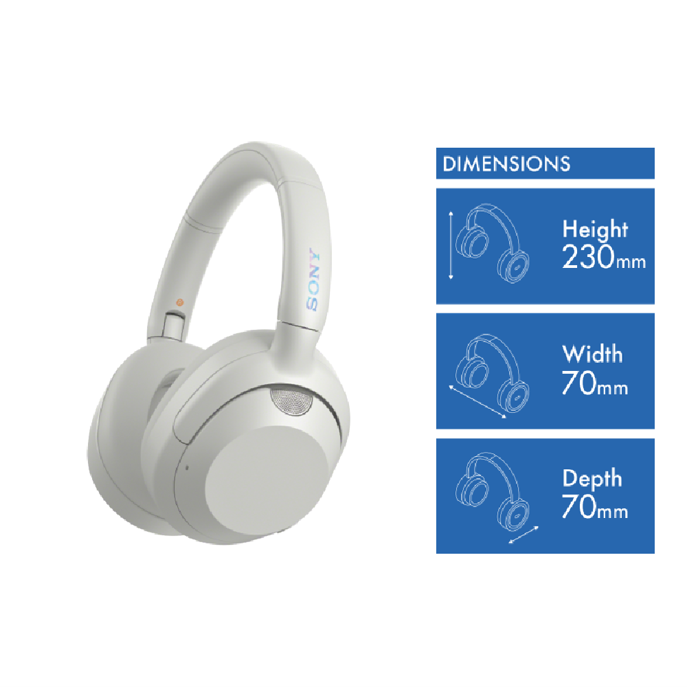 The Sony WHULT900NW are Over Ear Wireless Noise Cancelling Headphones. They feature powerful deep sound designed to make your heart tremble. Prepare to feel the bass. Press the ULT button for powerful sound thanks to the specially designed 40 mm driver unit and Integrated Processor V1. Enjoy precise punchy high-quality sound that gets you as close to the original recording as possible. Tailor sound to your personal preference. Choose from a variety of pre-sets to match sound quality with the genre of music you're listening to. With compatible smartphones and services head tracking creates a realistic and compelling listening experience by automatically adjusting sound fields to compensate for your head movement. Sounds are precisely aligned with your smartphone screen even as you move to completely involve you in your viewing. With up to 30 hours of battery life you ll have enough power to keep listening all day and into the night. And if you need to top up in a hurry a 3-minute quick charge will give you up to 90 minutes extra play time. Battery life is up to 50 hours with Noise Cancelling off.