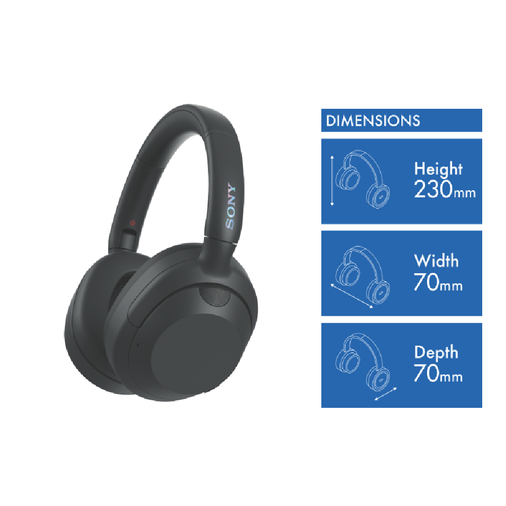 The Sony WHULT900NB are Over Ear Wireless Noise Cancelling Headphones. They feature powerful deep sound designed to make your heart tremble. Prepare to feel the bass. Press the ULT button for powerful sound thanks to the specially designed 40 mm driver unit and Integrated Processor V1. Enjoy precise punchy high-quality sound that gets you as close to the original recording as possible. Tailor sound to your personal preference. Choose from a variety of pre-sets to match sound quality with the genre of music you're listening to. With compatible smartphones and services head tracking creates a realistic and compelling listening experience by automatically adjusting sound fields to compensate for your head movement. Sounds are precisely aligned with your smartphone screen even as you move to completely involve you in your viewing. With up to 30 hours of battery life you ll have enough power to keep listening all day and into the night. And if you need to top up in a hurry a 3-minute quick charge will give you up to 90 minutes extra play time. Battery life is up to 50 hours with Noise Cancelling off.