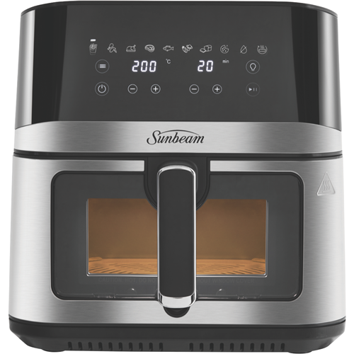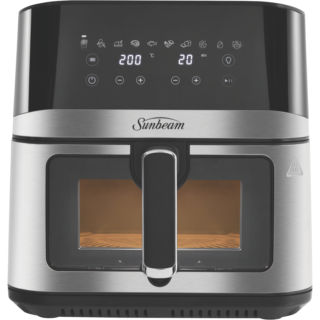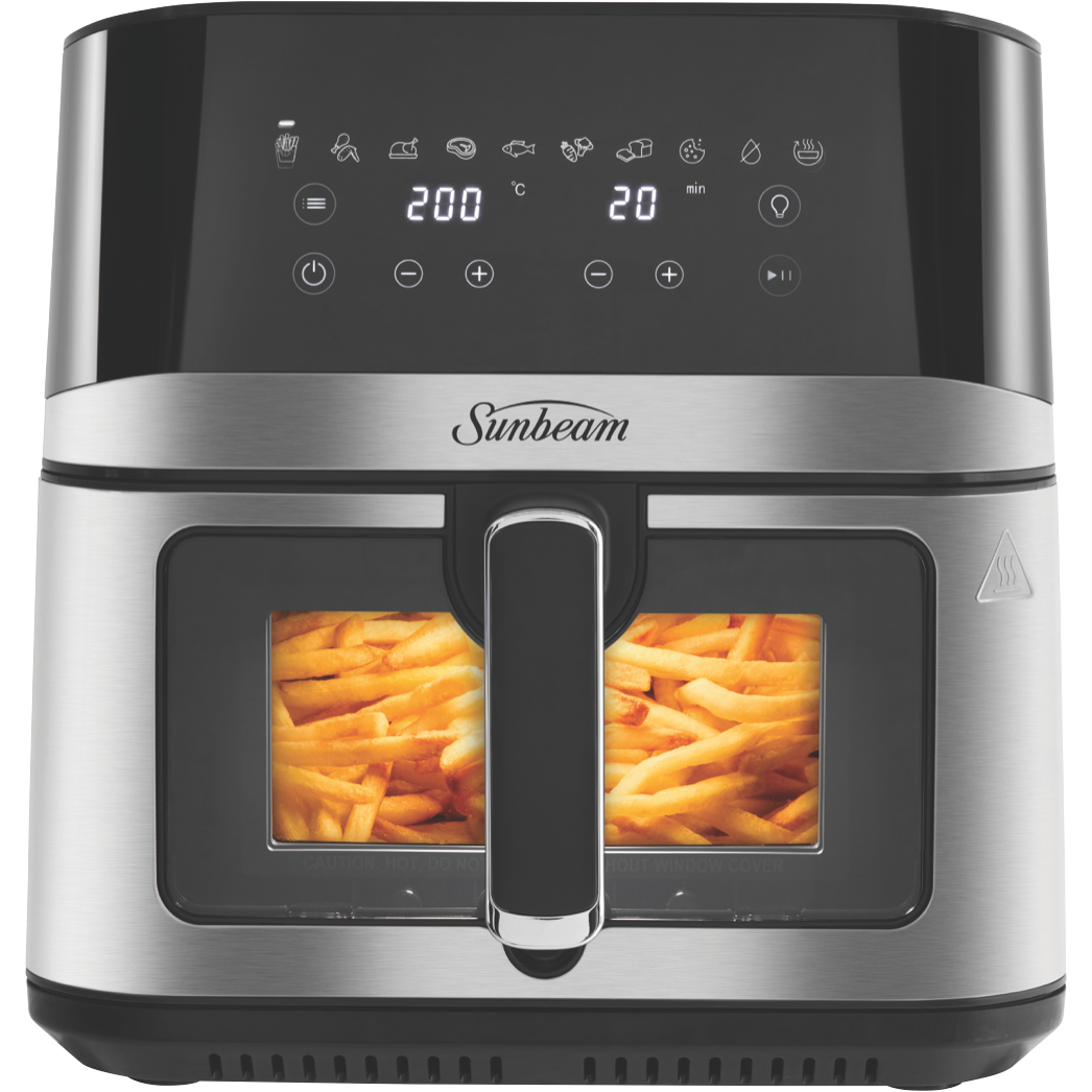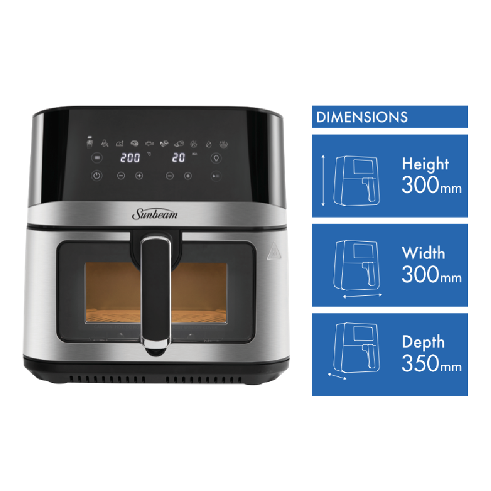 Want to cook healthier meals without sacrificing taste? This Sunbeam Air Fryer makes it easy. With a big 7.5 litre capacity you can whip up crispy fries or a whole chicken for the family. It's got 10 handy presets for everything from steak to veggies so you don't have to guess cooking times. The digital controls let you set temps from 40 to 200°C for perfect results. The non-stick basket and DiamondForce coated tray make cleanup a breeze - just pop them in the dishwasher. There's even a viewing window to check on your food without opening it up. At 5.6kg with a 70cm cord it's easy to move around the kitchen too. Sunbeam backs it with a 1 year warranty so you can cook with confidence. Give healthier tastier meals a try with the AFP4570DF air fryer.