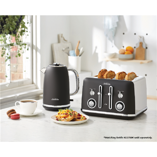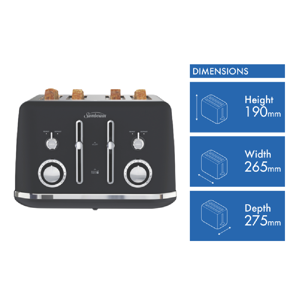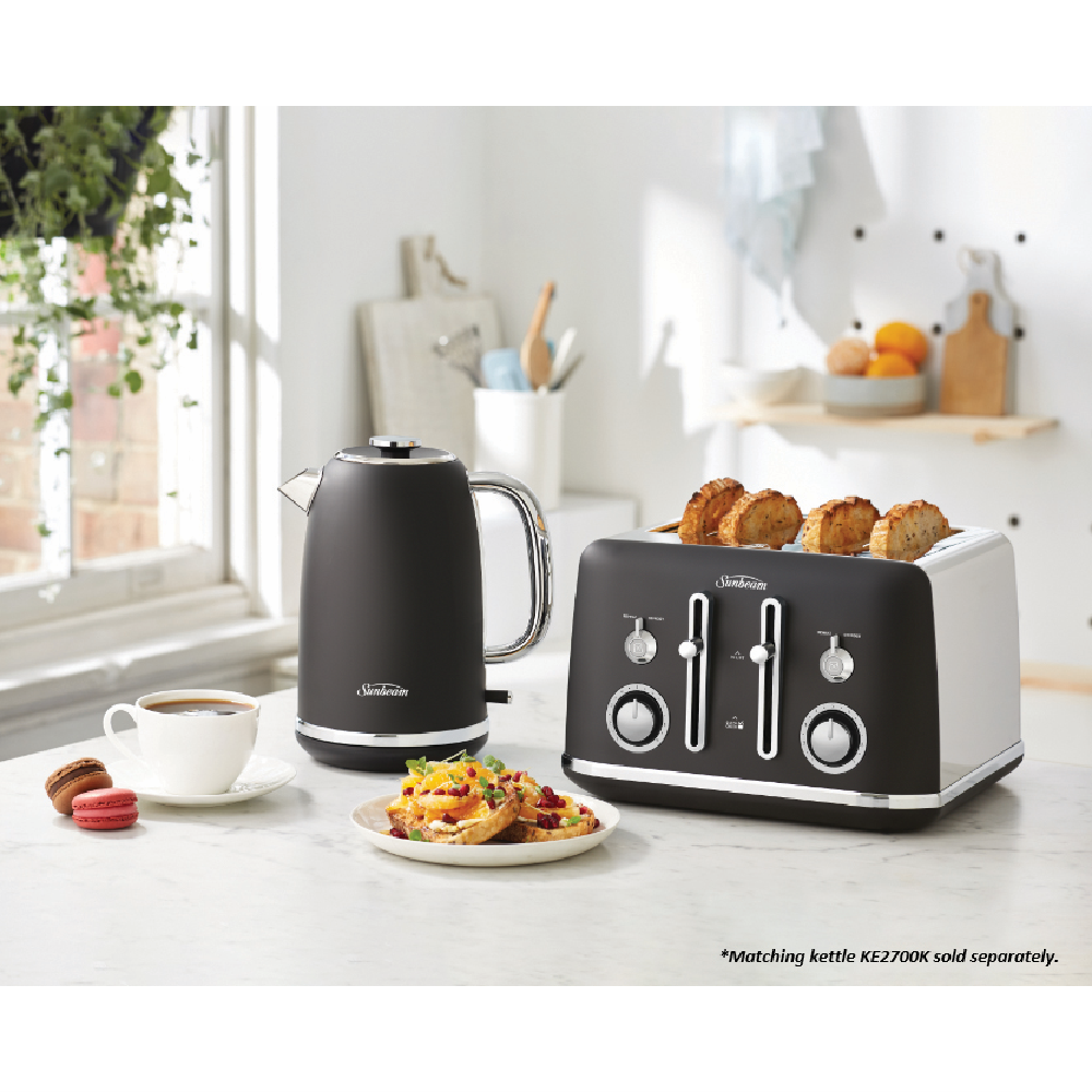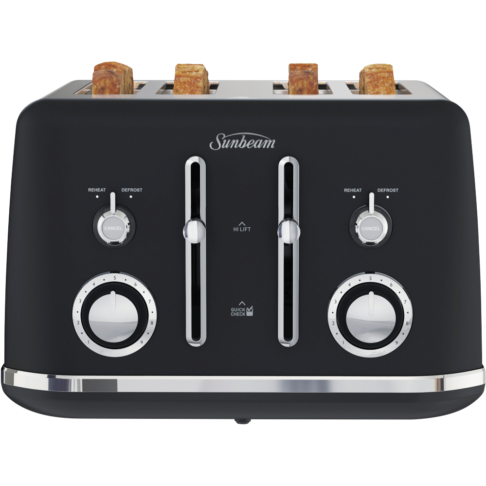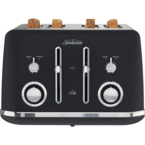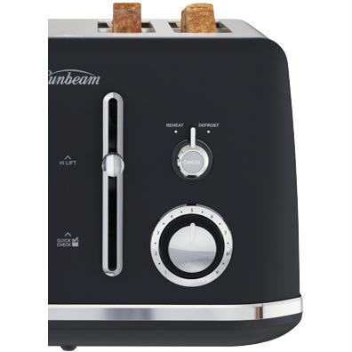 This Sunbeam Alinea Collection Toaster TA2740K features a 4-slice capacity in Sunbeam's Black Classics design for a pop of classic styling on your kitchen bench. It has variable browning control so you can set for light and golden or crispy brown as well as Defrost and Reheat settings. It also has high lift functionality including QuickCheck so you can monitor progress without interrupting toasting itself. The Sunbeam toaster's cord storage helps you maintain a neat bench. You can turn breakfast into a toast fest thanks to this black Sunbeam toaster.