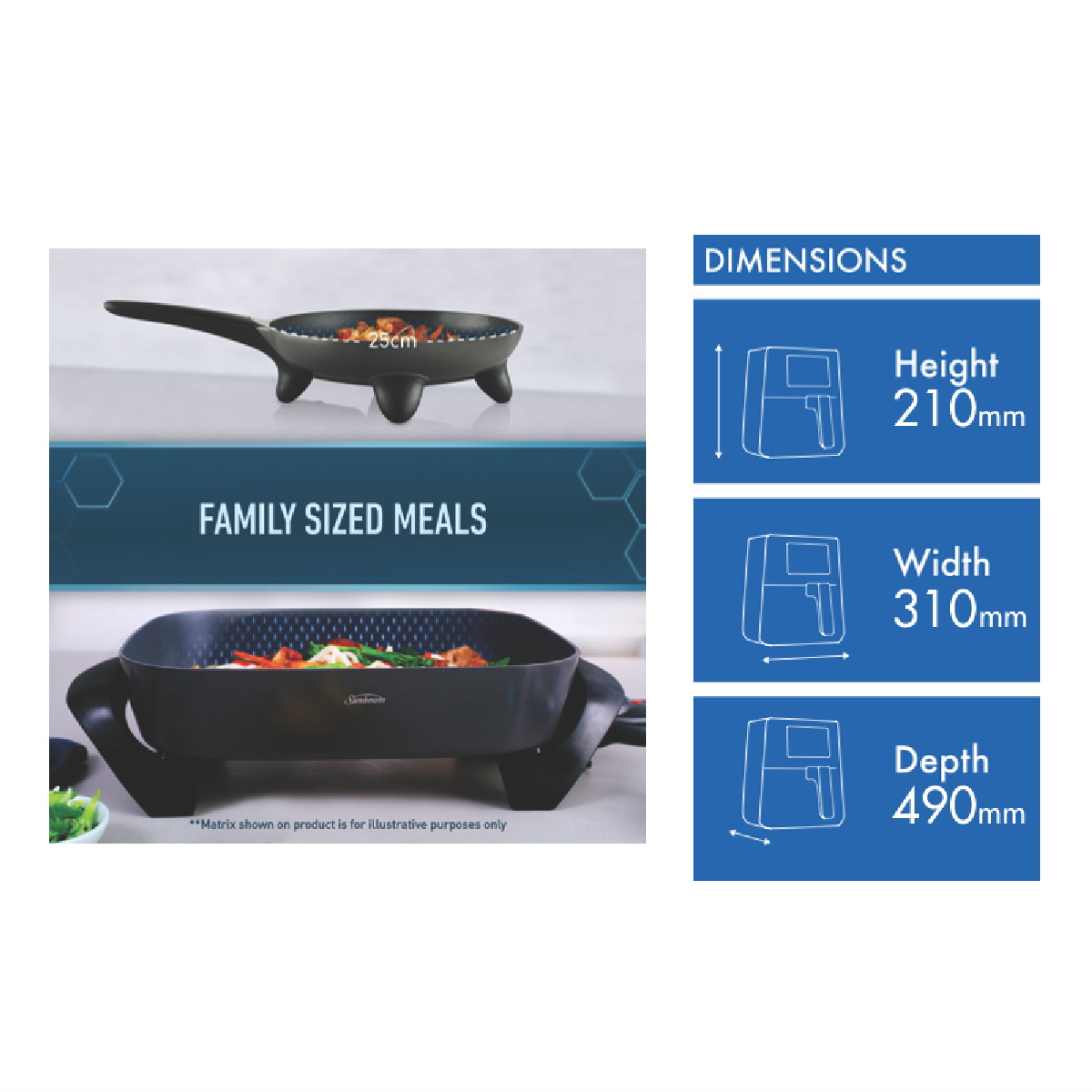 Additional Features Frypan tilt lever, Unique Interlocking Diamond Matrix Reinforced 2 Layer Coating, 38 x 30.5 frypan, 28cm diameter skillet