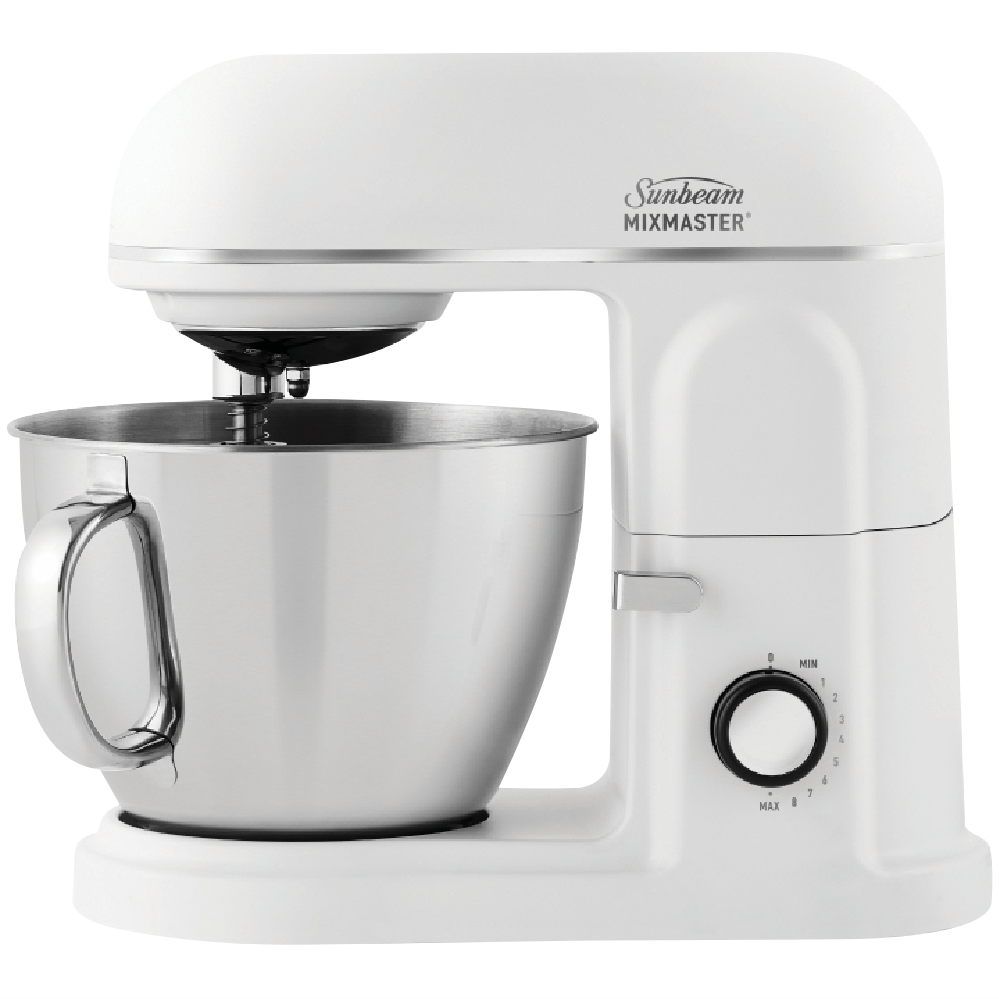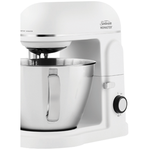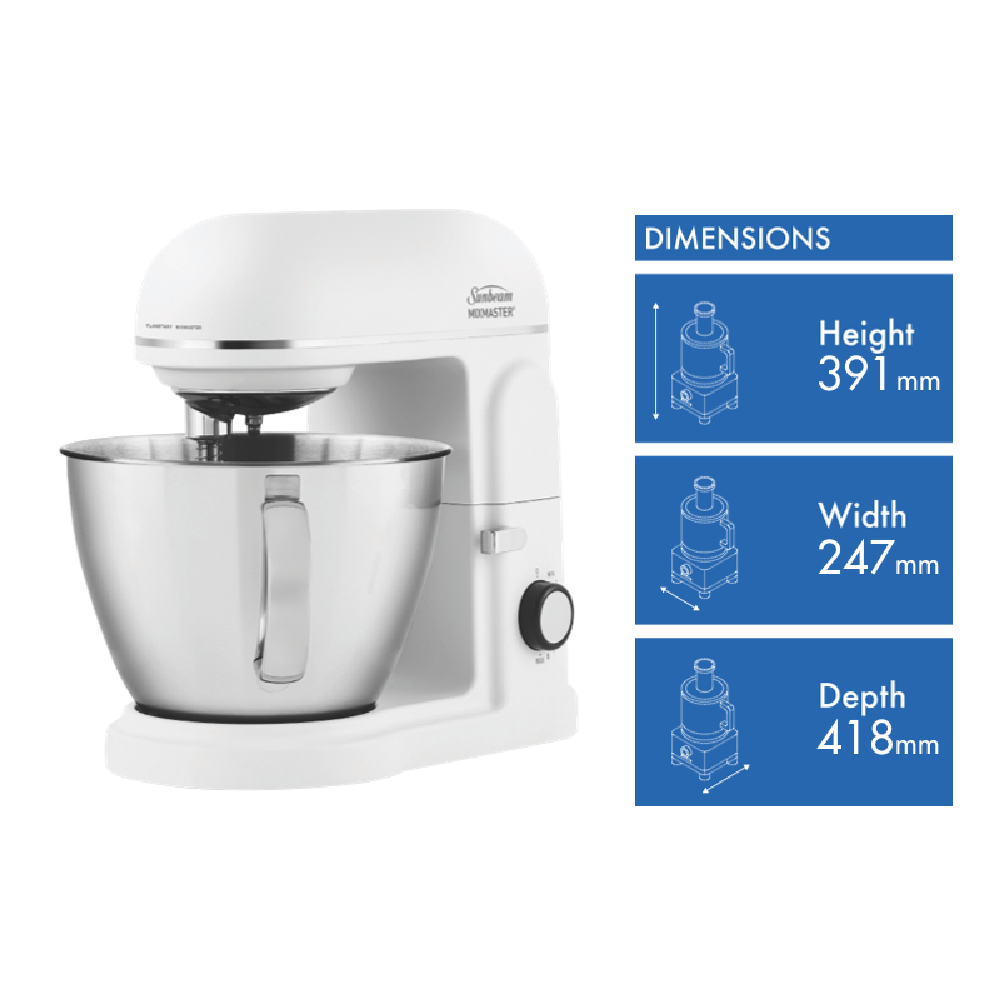 Take your baking to the next level with the Sunbeam Planetary Mixmaster The Master One stand mixer. This powerful 850W mixer features a 5L bowl capacity and 8 speeds making it ideal for mixing kneading and whipping all your favorite recipes. The tilt-back head provides easy access for adding ingredients while the planetary mixing action ensures thorough 360° coverage. With dishwasher-safe beaters and hooks clean up is a breeze. Durable enough for pizza and bread doughs the Master One mixer will be your kitchen's MVP. Accessories include a scraper beater diecast beater and dough hook stainless steel whisk and spatula for convenience. In white this mixer adds a touch of classic style to your countertop. Visualize the possibilities with the Master One. The manufacturer's part number for this product is MXM5000WH. Discover how this quality stand mixer can inspire your culinary creativity today.
