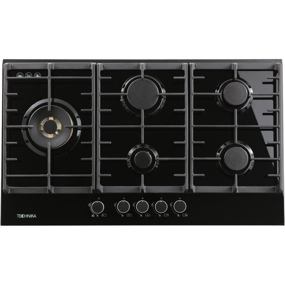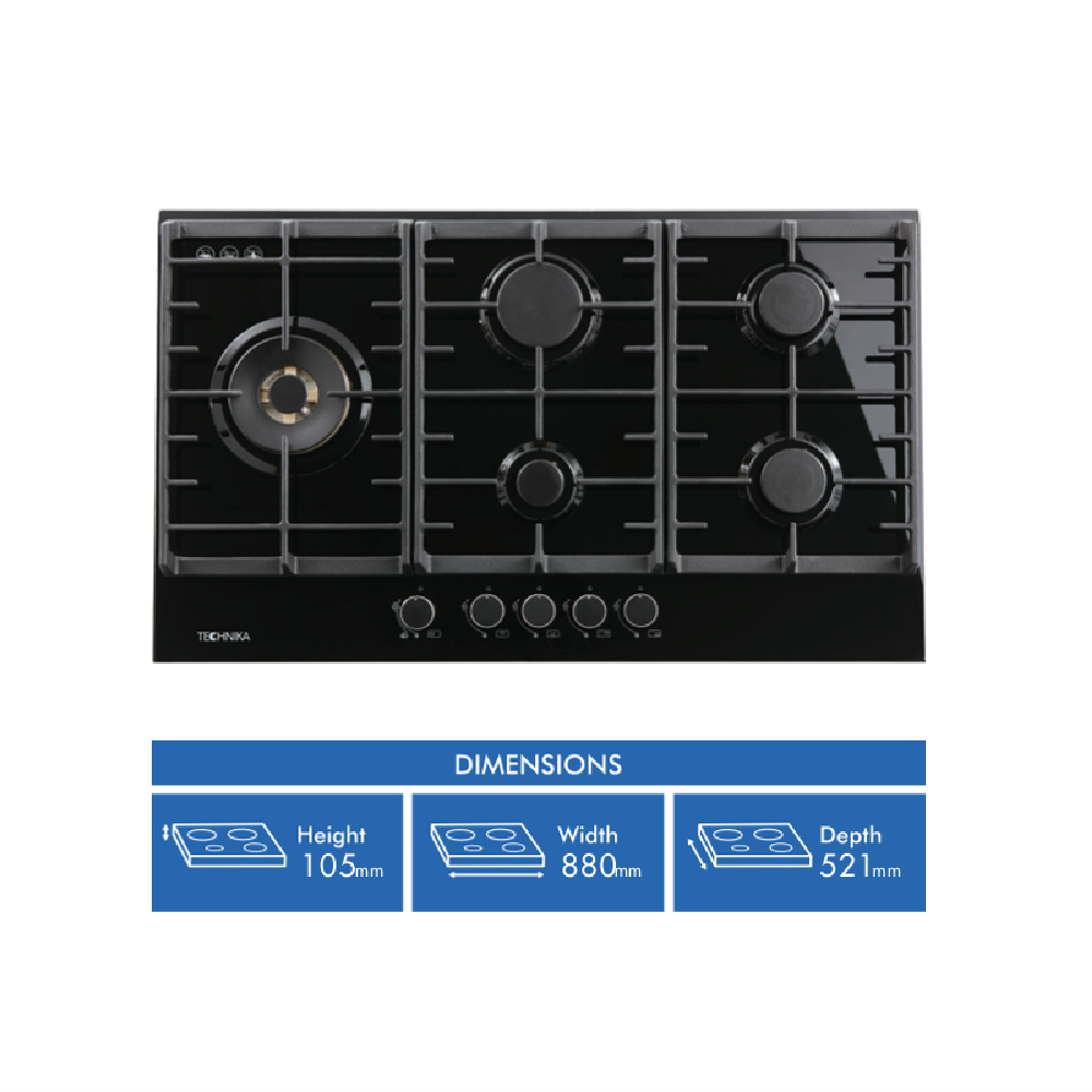 This spacious 90cm gas-on-glass black Technika gas cooktop has five burners including a dual valve wok burner so you can go from high-powered stir-frying or boiling right down to the lowest of simmers using the small inner flame only. The Technika TGC9GLBK features electronic ignition allowing you to achieve the level of gas you need very quickly by operating the conveniently-positioned front control knobs. It has cast iron trivets and burner caps to effortlessly hold the heaviest of cookware. Keeping your Technika black glass gas cooktop clean is easy with a wipe using a damp cloth and a mild non-abrasive cleaning detergent for more stubborn residue. You'll easily get different meals cooking at once with this generously-sized Technika gas cooktop.