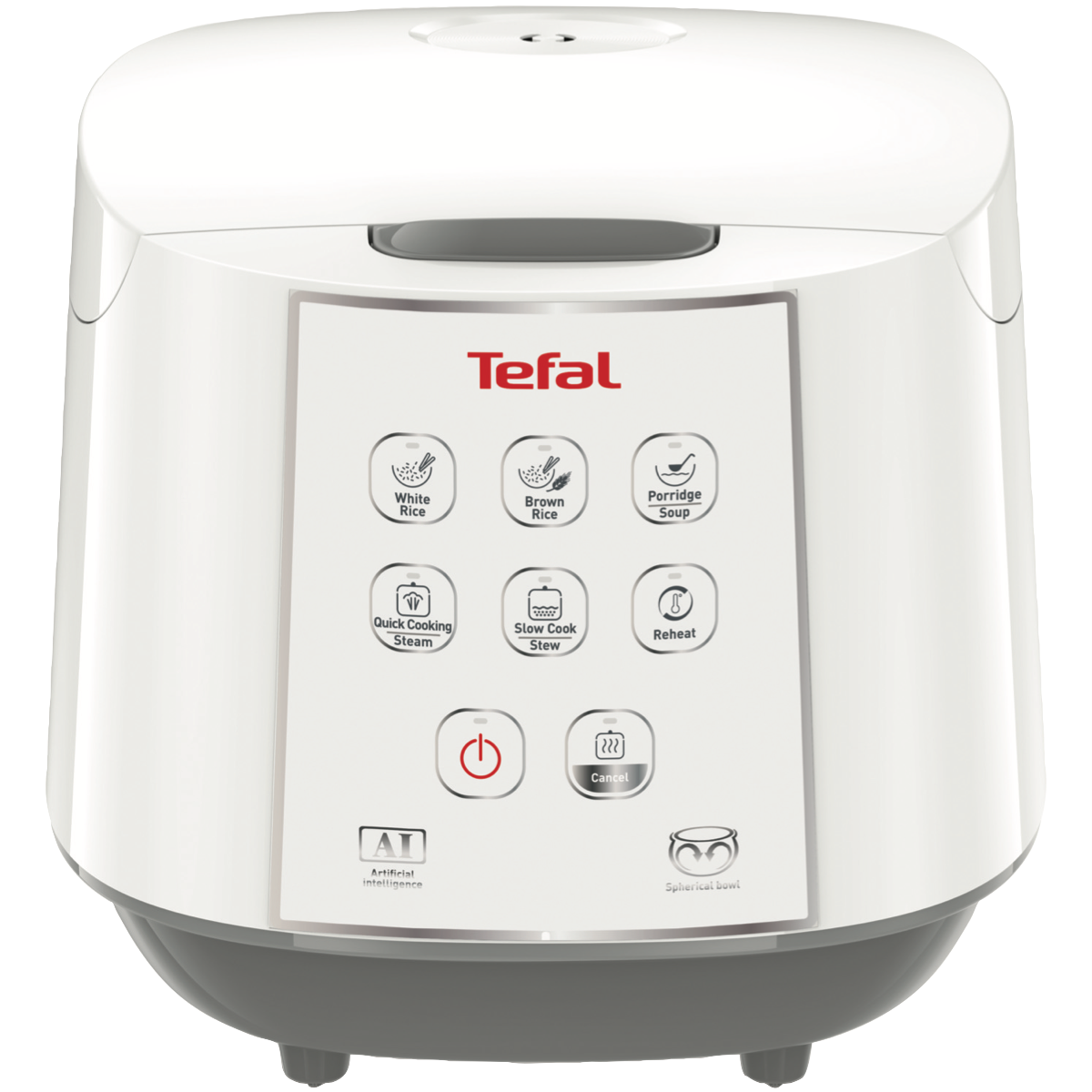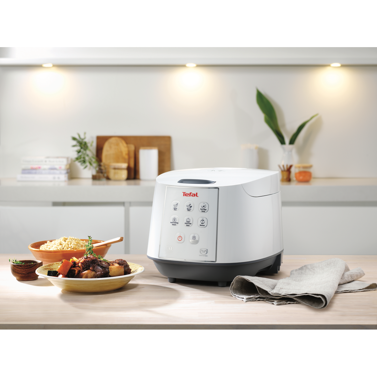 Step up your rice and slow cooking game with the versatile Tefal Easy Rice & Slow Cooker. This all-in-one multicooker features 8 preset programs to perfectly cook white rice brown rice porridge soup stews steam vegetables quickly reheat leftovers and keep meals warm for up to 12 hours. The high-quality non-stick inner pot with multilayer coating allows effortless food release and easy cleanup. The integrated steaming basket lets you steam veggies and side dishes while rice cooks below. Programmable up to 8 hours the Slow Cook mode tenderizes meats and stews for family-friendly favourites. An ample 10 cup capacity feeds the whole household. This Rice Cooker & Steamer from Tefal is designed with convenience in mind. The compact 322mm height fits neatly on countertops. Removable parts like the steam tray bowl and spatula are top-rack dishwasher safe for fast cleanup. Prepare perfectly cooked rice and so much more using Tefal s thoughtful presets. This multicooker comes complete with a measuring cup rice spatula soup spoon steam basket and 2 year warranty. The manufacturer's part number for this product is RK732. Discover how easy home-cooked meals can be with the Tefal Easy Rice & Slow Cooker.