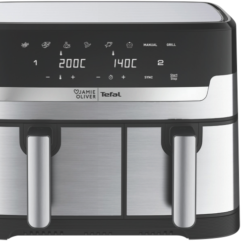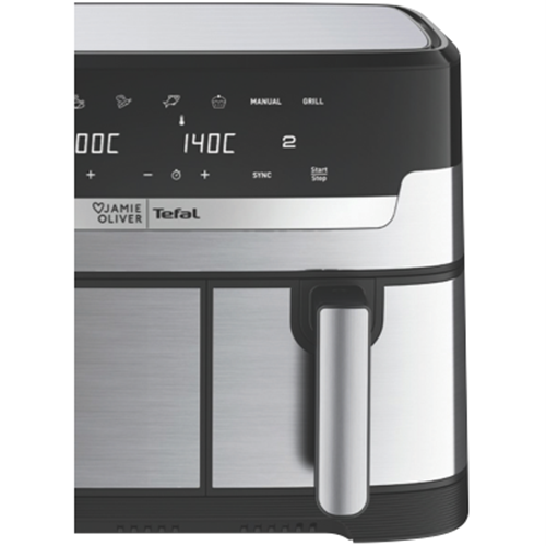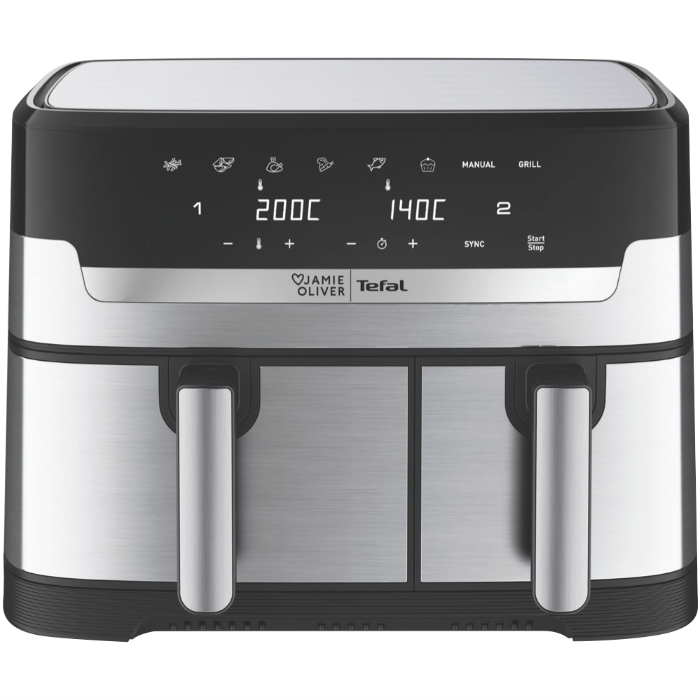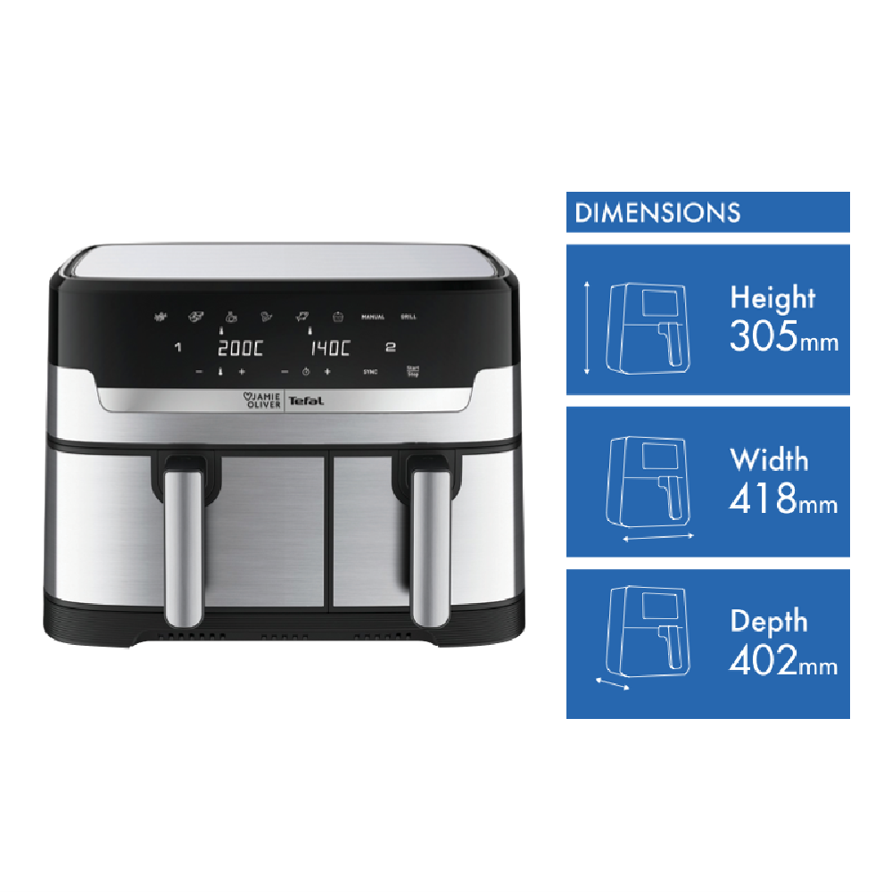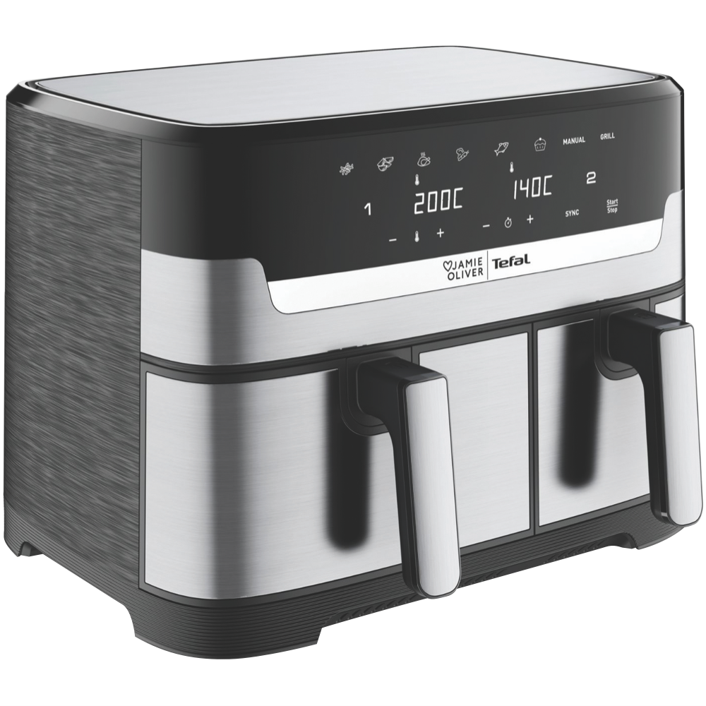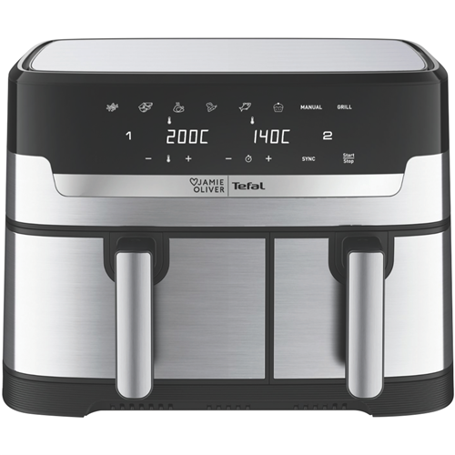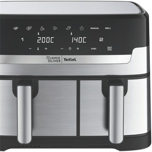 Cook two different dishes at once with the Tefal Jamie Oliver Dual Air Fryer. This clever kitchen helper features two separate drawers - a 5.2 litre drawer perfect for roast chicken and a 3.1 litre drawer ideal for vegetables. The sync mode coordinates cooking times so everything finishes together while 8 cooking programs and manual functions let you prepare a wide variety of meals with ease. The large LCD screen displays icons for all settings and the non-stick grills and drawers are easy to clean. Includes a built-in die-cast grill plate regular plate and quick-start recipe guide. Backed by a 1 year warranty. Model number: EY905J.