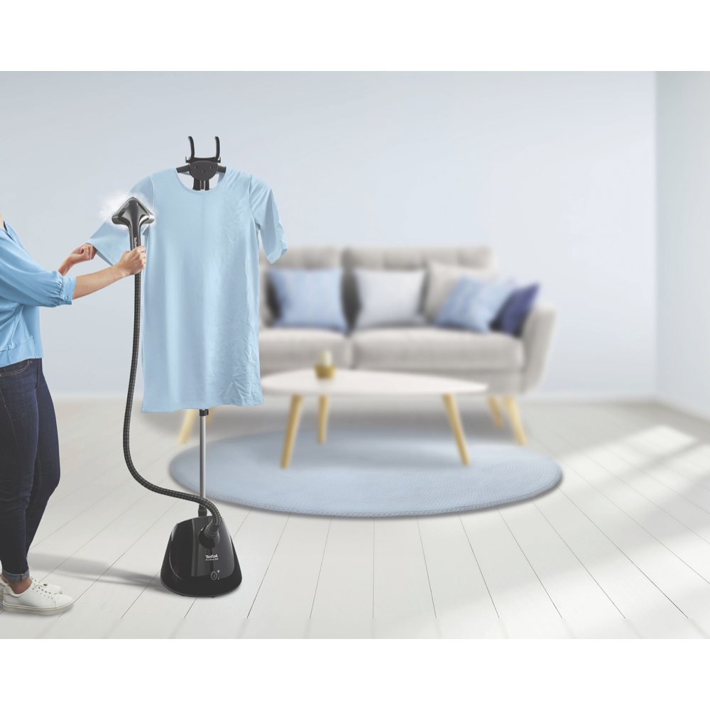 Streamline your garment care routine with the Tefal Pro Style One Garment Steamer. This powerful garment steamer removes creases and refreshes fabrics in seconds letting you achieve a crisp professionally pressed look at home. With 1700 watts of power it generates up to 30 grams of steam per minute across two adjustable steam settings penetrating deeper into fabric fibers to relax wrinkles. The extra-large 1.5 liter removable water tank allows up to 60 minutes of continuous steam between refills. Equipped with convenient features like integrated pants clips a foldable hanger and a hanger hook this steamer lets you steam garments right on the hanger for efficient pressing. It also heats up in just 45 seconds so you can start steaming almost instantly. An anti-scale system helps prevent mineral buildup while a fabric brush attachment gently lifts nap. Covered by a 2 year warranty this garment steamer by Tefal will keep your clothes looking neat and wrinkle-free every day.