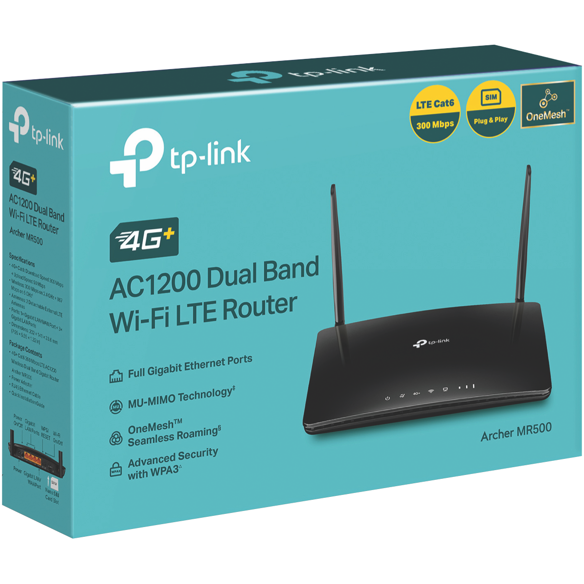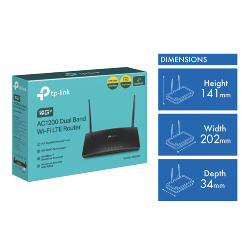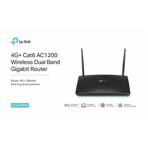 Connect and browse faster than ever with the TP-LINK 4G+ Cat6 AC1200 Dual Band Wireless Gigabit Router. This powerful router features 4G LTE speeds and dual band Wi-Fi for lightning fast downloads streaming and gaming. Equipped with advanced AC1200 wireless technology it provides up to 867Mbps on the crystal clear 5GHz band and 300Mbps on the 2.4GHz band for complete home coverage. The integrated 4G LTE modem delivers 4G internet access when fixed line broadband is not available. With Gigabit WAN and LAN ports it provides ultrafast wired speeds too. Setup is quick and easy with the free Tether app. This router also packs enterprise level security protocols to protect your network and devices. Sleek compact and designed to sit flat it suits any home decor. Enjoy lag-free connectivity throughout your home with the TP-LINK 4G+ Cat6 AC1200 Wireless Dual Band Gigabit Router. The manufacturer's part number for this product is ARCHER-MR500. Check out this high performance router today for fast and reliable home networking.