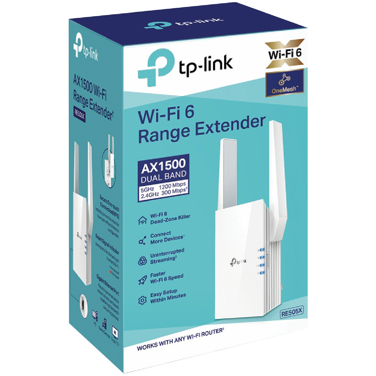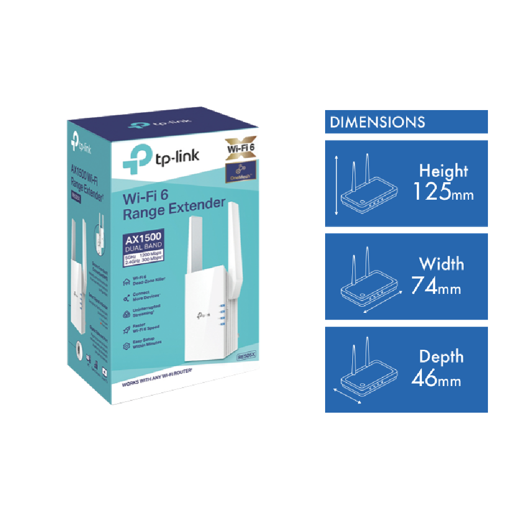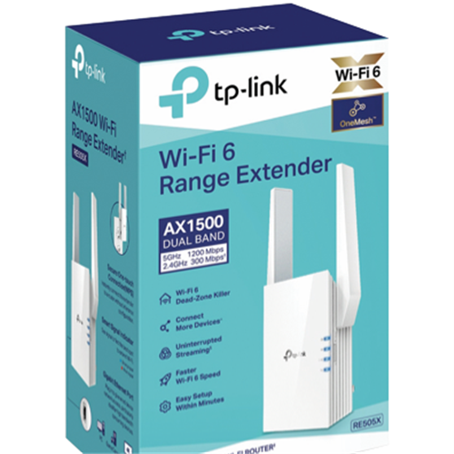 Leave dead zones behind and experience seamless whole-home Wi-Fi coverage with the TP-LINK AX1500 Wi-Fi 6 Range Extender. This sleek white extender allows you to easily expand your existing Wi-Fi coverage to eliminate frustrating dead zones around your home. With dual-band technology providing speeds of 300Mbps on the 2.4GHz band and 1200Mbps on the 5GHz band you'll enjoy lightning-fast streaming gaming and more no matter where you are. Setup takes just minutes with the TP-Link Tether app allowing you to find the optimal location and enjoy simple intuitive management right from your smartphone. Advanced features like beamforming direct signals to your devices for stronger faster connections while the latest WPA3 encryption keeps your network locked down tight. With TP-Link's range extender you can leave patchy Wi-Fi and buffering behind enjoying the reliable wall-to-wall wireless coverage your smart home demands. Experience next-level streaming gaming and more with speeds up to 1.5Gbps. The manufacturer's part number for this product is RE505X. Give your home the Wi-Fi it deserves.