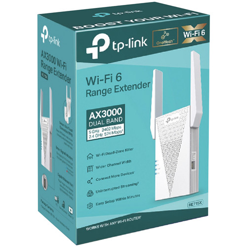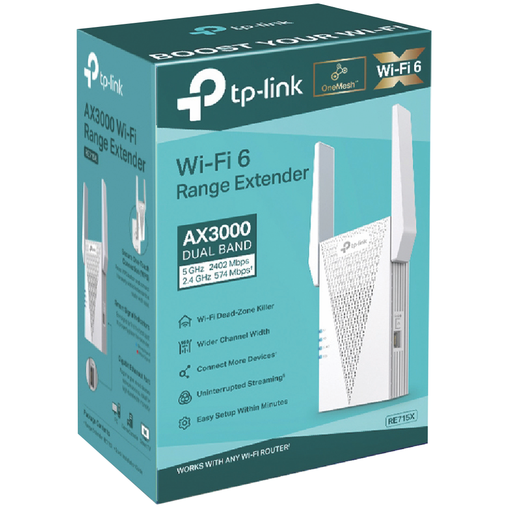 Boost your home Wi-Fi coverage with this AX3000 Mesh Wi-Fi 6 Extender featuring two external antennas that eliminate dead zones throughout your home. The white range extender delivers impressive speeds of up to 2402 Mbps on 5 GHz and 574 Mbps on 2.4 GHz so you can stream and game without frustrating lag. Connect wired devices through the Gigabit Ethernet port while enjoying the security of multiple protocols including WEP WPA WPA2 and WPA3. Compact at just 160mm × 107mm × 40mm it fits discreetly in any room. Comes with a 3-year warranty. Model RE715X.